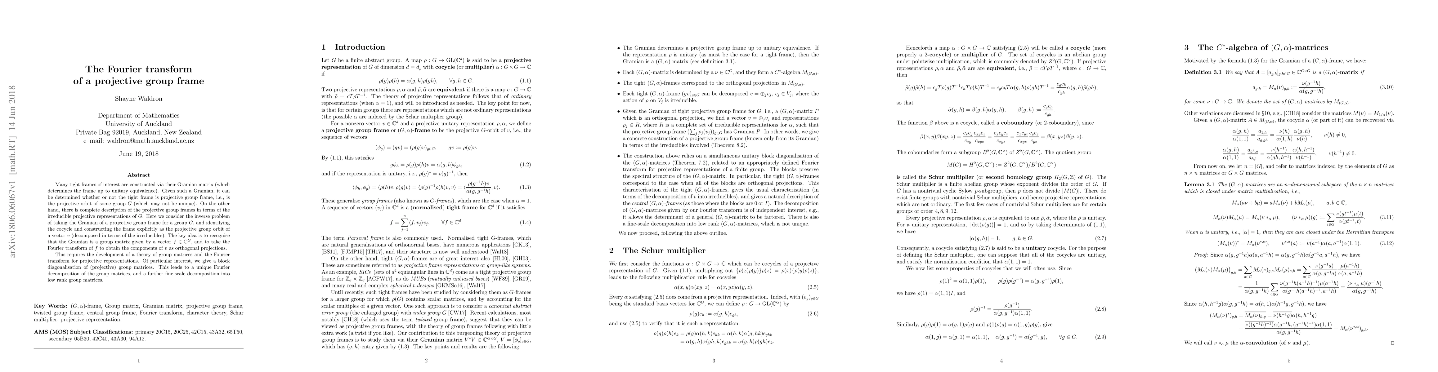 This paper explores the Fourier transform of projective group frames, focusing on the Gramian matrix that determines the frame. It develops a theory for decomposing group matrices into irreducible components and provides a unique Fourier decomposition, leading to a block diagonalisation and a fine-scale decomposition into low-rank matrices.