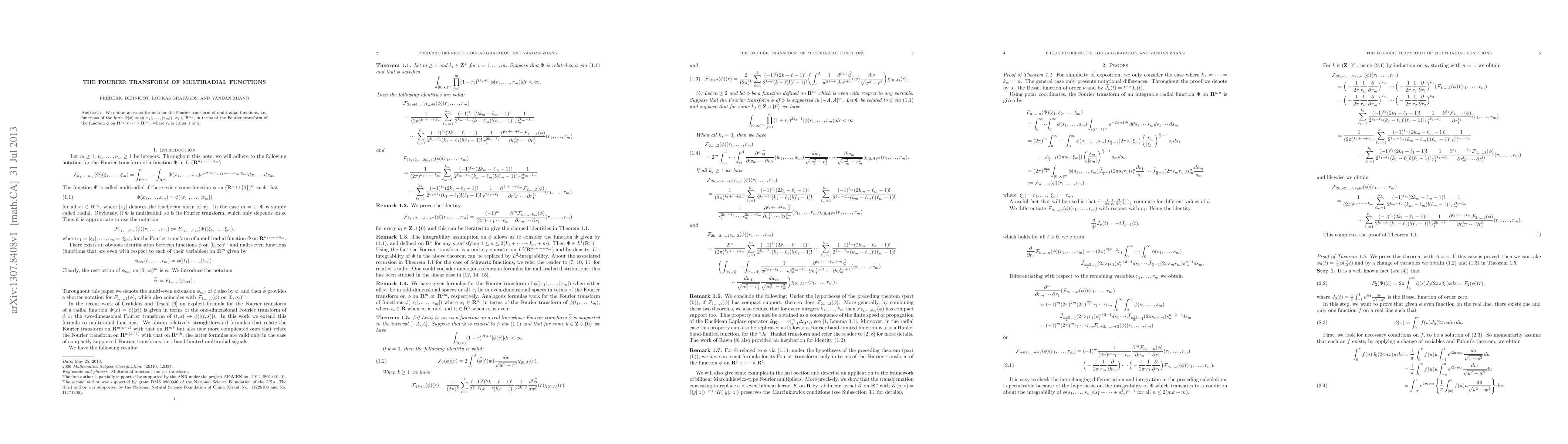 This paper derives an exact formula for the Fourier transform of multiradial functions, which are defined as functions dependent on the magnitudes of their components in multiple dimensions. The result expresses the Fourier transform in terms of the transform of the underlying radial function.