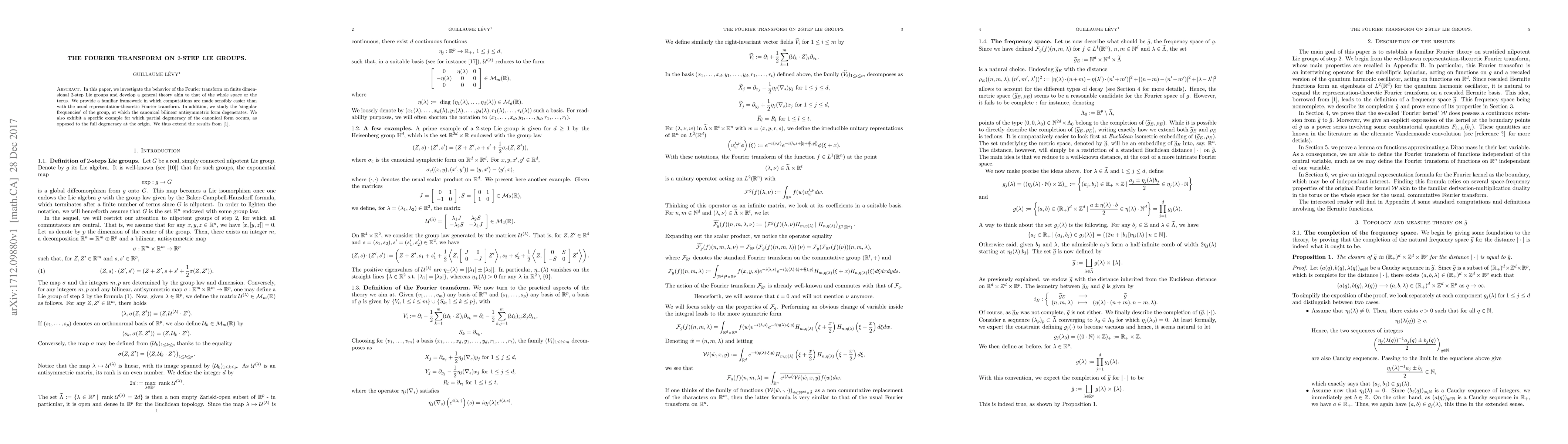 This paper develops a simplified theory for the Fourier transform on 2-step Lie groups, easing computations compared to traditional methods. It also explores 'singular frequencies' where the canonical bilinear antisymmetric form becomes degenerate, providing a specific example of partial degeneracy.