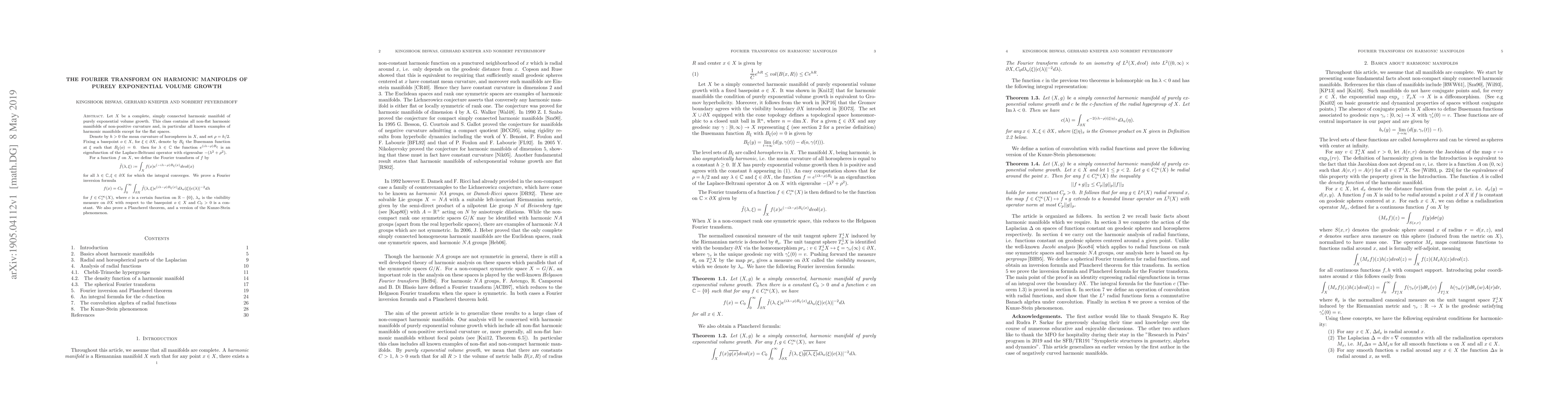This paper studies the Fourier transform on complete, simply connected harmonic manifolds of purely exponential volume growth, proving a Fourier inversion formula and a Plancherel theorem for smooth functions. It also explores the Kunze-Stein phenomenon in this context.