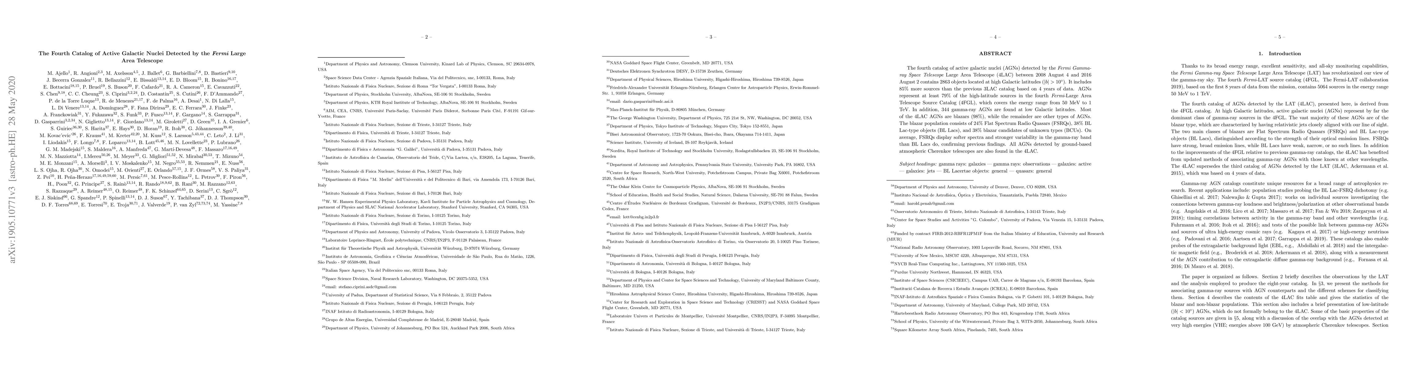 The fourth catalog from the Fermi Gamma-ray Space Telescope's Large Area Telescope (4LAC) lists 2863 high-latitude active galactic nuclei (AGNs), 85% more than the previous catalog, with AGNs comprising 79% of high-latitude sources. Most AGNs are blazars, including FSRQs, BL Lacs, and blazar candidates.