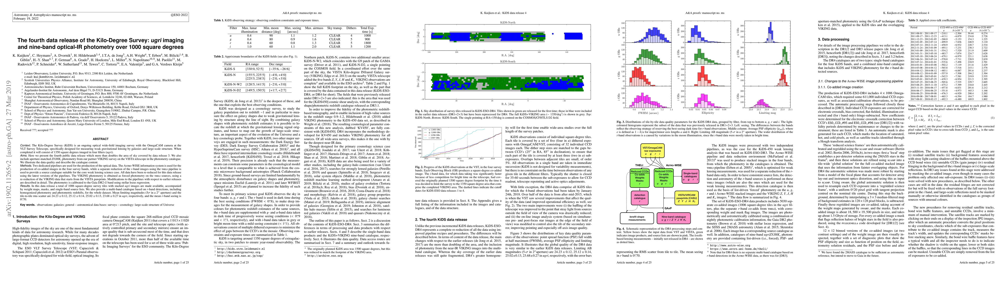 The Kilo-Degree Survey's fourth data release presents ugri imaging and nine-band optical-IR photometry over 1000 square degrees, doubling the sky coverage from the previous release. The data includes re-reduced images and photometry calibrated to the Gaia DR2 G band, with mean limiting magnitudes in the ugri filters ranging from 23.68 to 25.12.