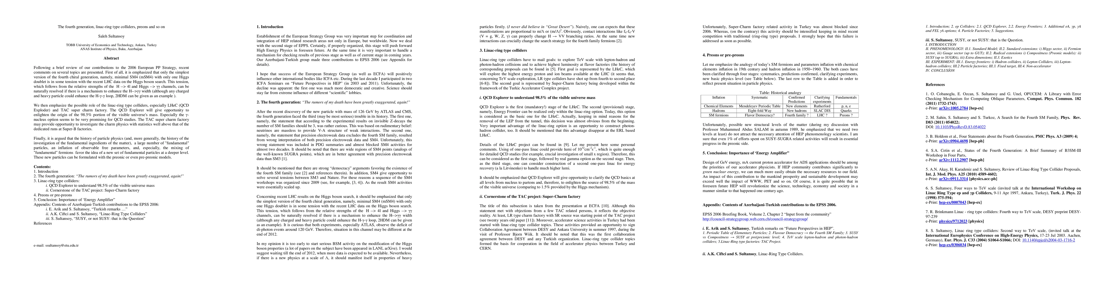 Following a brief review of our contributions to the 2006 European PP Strategy, recent comments on several topics are presented. First of all, it is emphasized that only the simplest version of the fourth chiral generation, namely, minimal SM4 (mSM4) with only one Higgs doublet is in some tension with the recent LHC data on the Higgs boson search. This tension, which follows from the relative strengths of the H --> 4l and Higgs --> {\gamma}{\gamma} channels, can be naturally resolved if there is a mechanism to enhance the H-->{\gamma}{\gamma} width (although any charged and heavy particle could enhance the H-{\gamma}-{\gamma} loop, 2HDM can be given as an example). We then emphasize the possible role of the linac-ring type colliders, especially LHeC (QCD Exploder) and TAC super charm factory. The QCD Explorer will give opportunity to enlighten the origin of the 98.5% portion of the visible universe's mass. Especially the {\gamma}-nucleus option seems to be very promising for QCD studies. The TAC super charm factory may provide opportunity to investigate the charm physics with statistics well above that of the dedicated runs at Super-B factories. Finally, it is argued that the history of particle physics (and, more generally, the history of the investigation of the fundamental ingredients of the matter), a large number of "fundamental" particles, an inflation of observable free parameters, and, especially, the mixing of "fundamental" fermions favor the idea of a new set of fundamental particles at a deeper level. These new particles can be formulated with the preonic or even pre-preonic models.