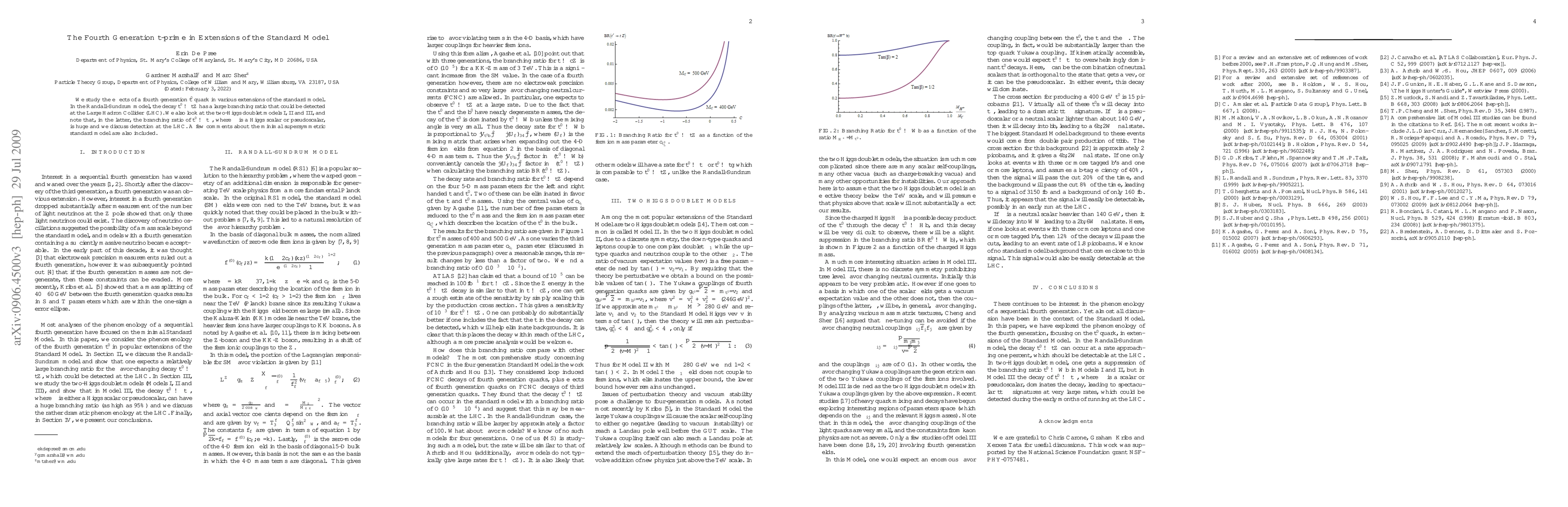 This paper investigates the implications of a fourth generation t' quark in various extensions of the Standard Model, highlighting its significant decay branching ratios in the Randall-Sundrum model and two-Higgs doublet models, with potential detection prospects at the LHC. It also briefly touches on the minimal supersymmetric standard model.