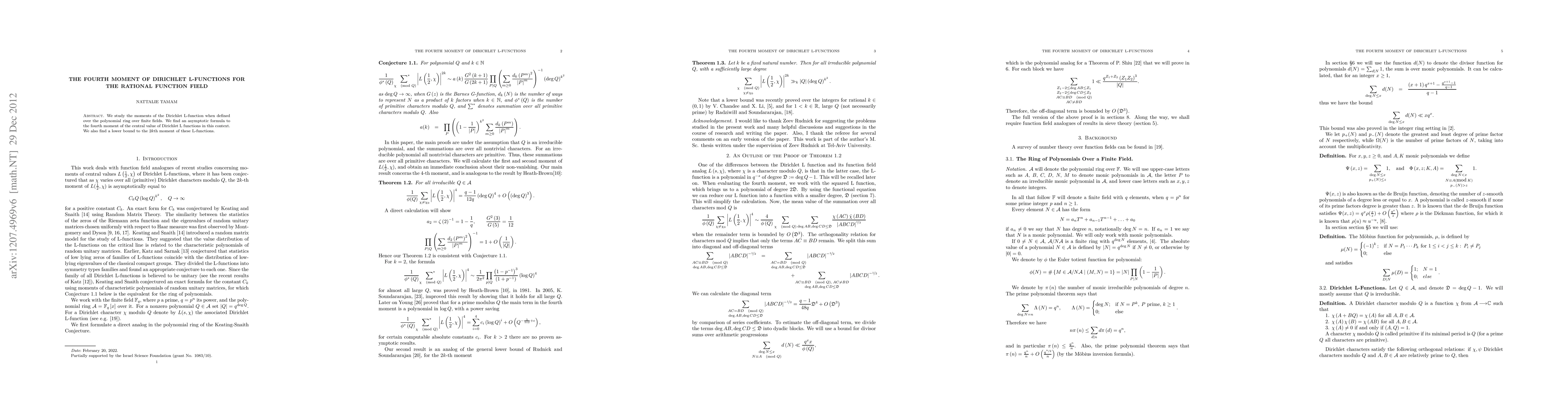We study the moments of the Dirichlet L-function when defined over the polynomial ring over finite fields. We find an asymptotic formula to the fourth moment of the central value of Dirichlet L functions in this context. We also find a lower bound to the 2kth moment of these L-functions.