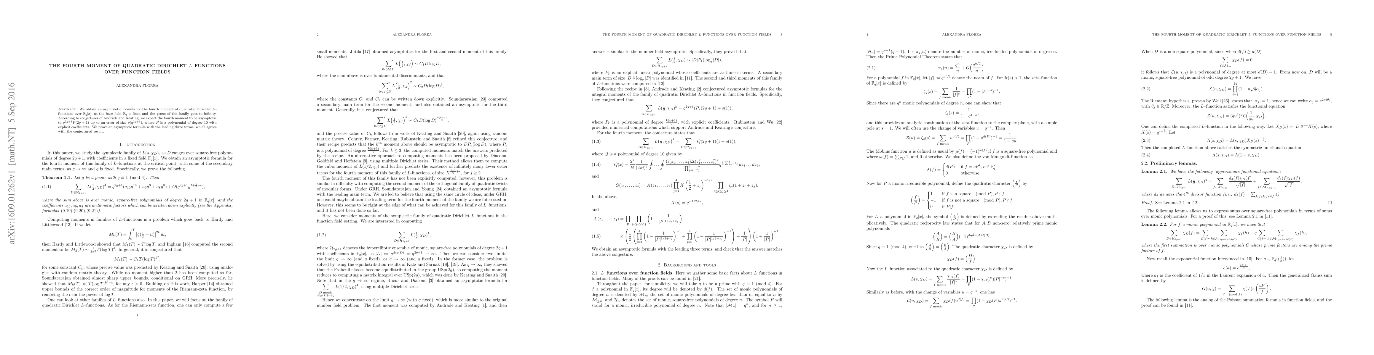 Researchers have developed an asymptotic formula for the fourth moment of quadratic Dirichlet L-functions over function fields, which agrees with a conjecture on its expected behavior as the genus goes to infinity.