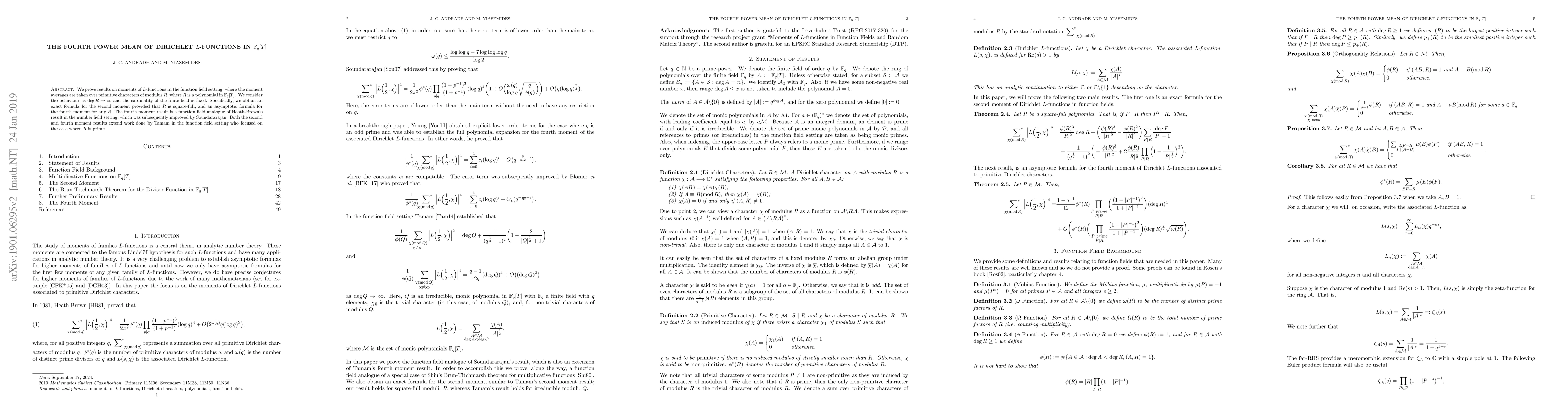 We prove results on moments of $L$-functions in the function field setting, where the moment averages are taken over primitive characters of modulus $R$, where $R$ is a polynomial in $\mathbb{F}_q [T]$. We consider the behaviour as $\textrm{deg} R \rightarrow \infty$ and the cardinality of the finite field is fixed. Specifically, we obtain an exact formula for the second moment provided that $R$ is square-full, and an asymptotic formula for the fourth moment for any $R$. The fourth moment result is a function field analogue of Heath-Brown's result in the number field setting, which was subsequently improved by Soundararajan. Both the second and fourth moment results extend work done by Tamam in the function field setting who focused on the case where $R$ is prime.