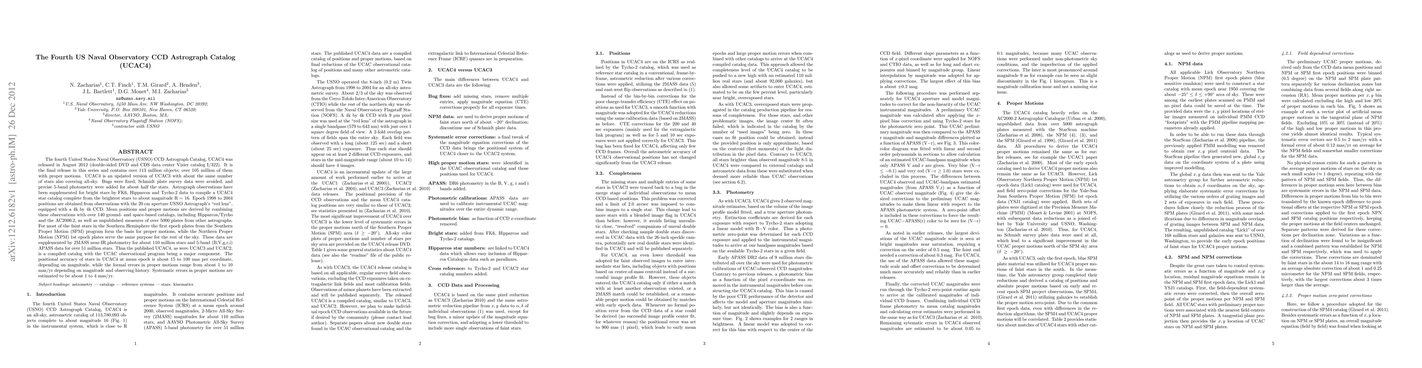The fourth United States Naval Observatory (USNO) CCD Astrograph Catalog, UCAC4 was released in August 2012 (double-sided DVD and CDS data center Vizier catalog I/322). It is the final release in this series and contains over 113 million objects; over 105 million of them with proper motions. UCAC4 is an updated version of UCAC3 with about the same number of stars also covering all-sky. Bugs were fixed, Schmidt plate survey data were avoided, and precise 5-band photometry were added. Astrograph observations have been supplemented for bright stars by FK6, Hipparcos and Tycho-2 data to compile a UCAC4 star catalog complete to about magnitude R = 16. Epoch 1998 to 2004 positions are obtained from observations with the 20 cm aperture USNO Astrograph's red lens, equipped with a 4k by 4k CCD. Mean positions and proper motions are derived by combining these observations with over 140 ground- and space-based catalogs, including Hipparcos/Tycho and the AC2000.2, as well as unpublished measures of over 5000 plates from other astrographs. For most of the faint stars the first epoch plates from the Southern Proper Motion (SPM) and the Northern Proper Motion (NPM) programs form the basis for proper motions. These data are supplemented by 2MASS near-IR photometry for about 110 million stars and 5-band (B,V,g,r,i) APASS data for over 51 million stars. Thus the published UCAC4, as were UCAC3 and UCAC2, is a compiled catalog with the UCAC observational program being a major component. The positional accuracy of stars in UCAC4 at mean epoch is about 15 to 100 mas per coordinate, depending on magnitude, while the formal errors in proper motions range from about 1 to 10 mas/yr depending on magnitude and observing history. Systematic errors in proper motions are estimated to be about 1 to 4 mas/yr.