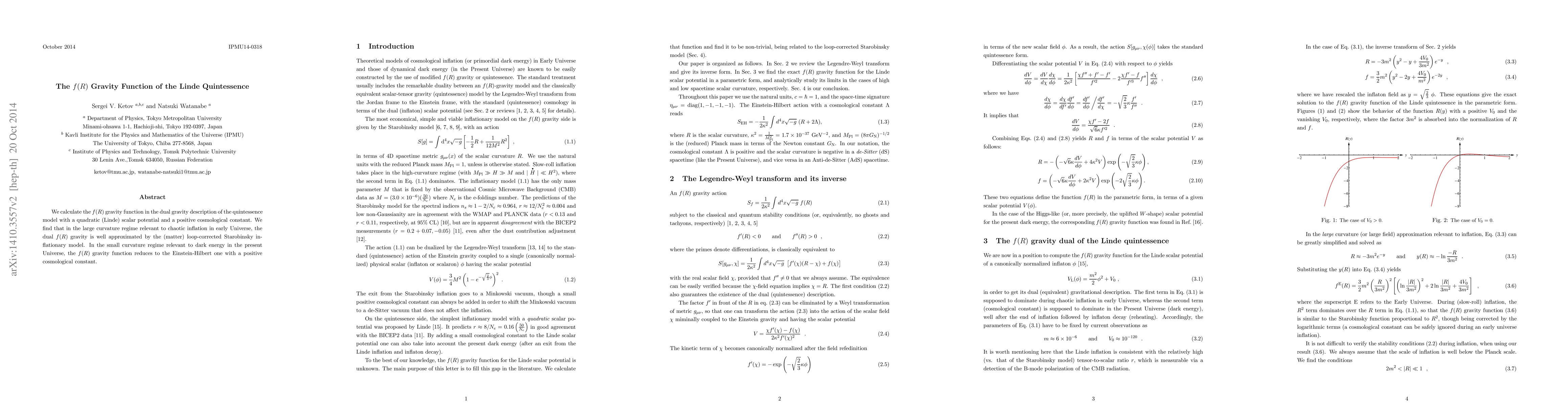 This paper investigates the f(R) gravity function in the context of the Linde quintessence model, showing that it approximates the Starobinsky inflationary model in high curvature scenarios, and reverts to Einstein-Hilbert gravity with a positive cosmological constant in the low curvature regime relevant to dark energy.