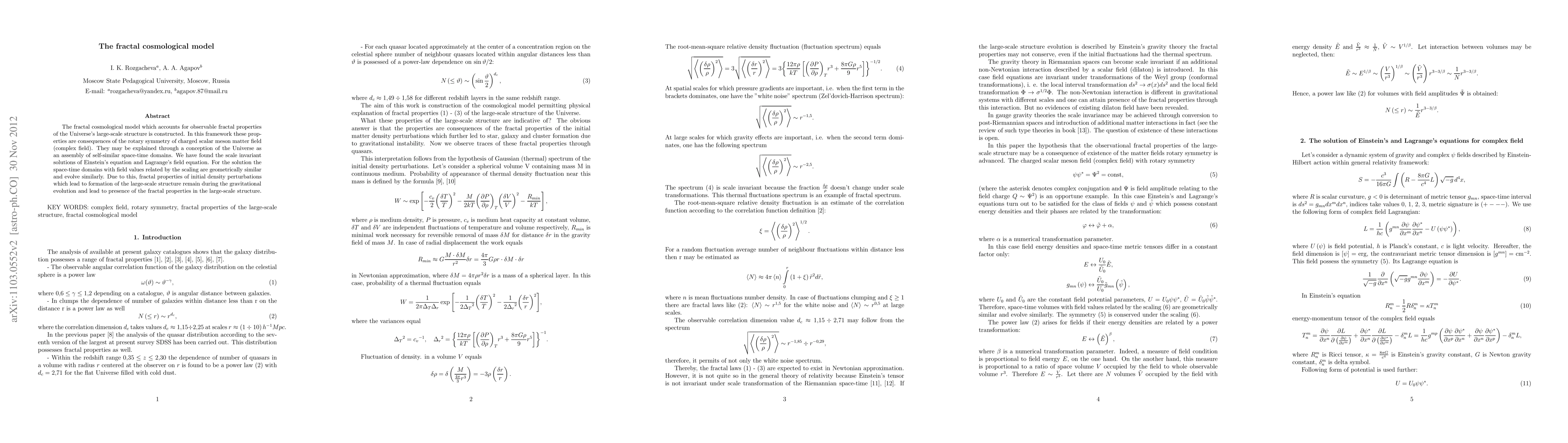 The fractal cosmological model which accounts for observable fractal properties of the Universe's large-scale structure is constructed. In this framework these properties are consequences of the rotary symmetry of charged scalar meson matter field (complex field). They may be explained through a conception of the Universe as an assembly of self-similar space-time domains. We have found the scale invariant solutions of Einstein's equation and Lagrange's field equation. For the solution the space-time domains with field values related by the scaling are geometrically similar and evolve similarly. Due to this, fractal properties of initial density perturbations which lead to formation of the large-scale structure remain during the gravitational evolution and lead to presence of the fractal properties in the large-scale structure.
