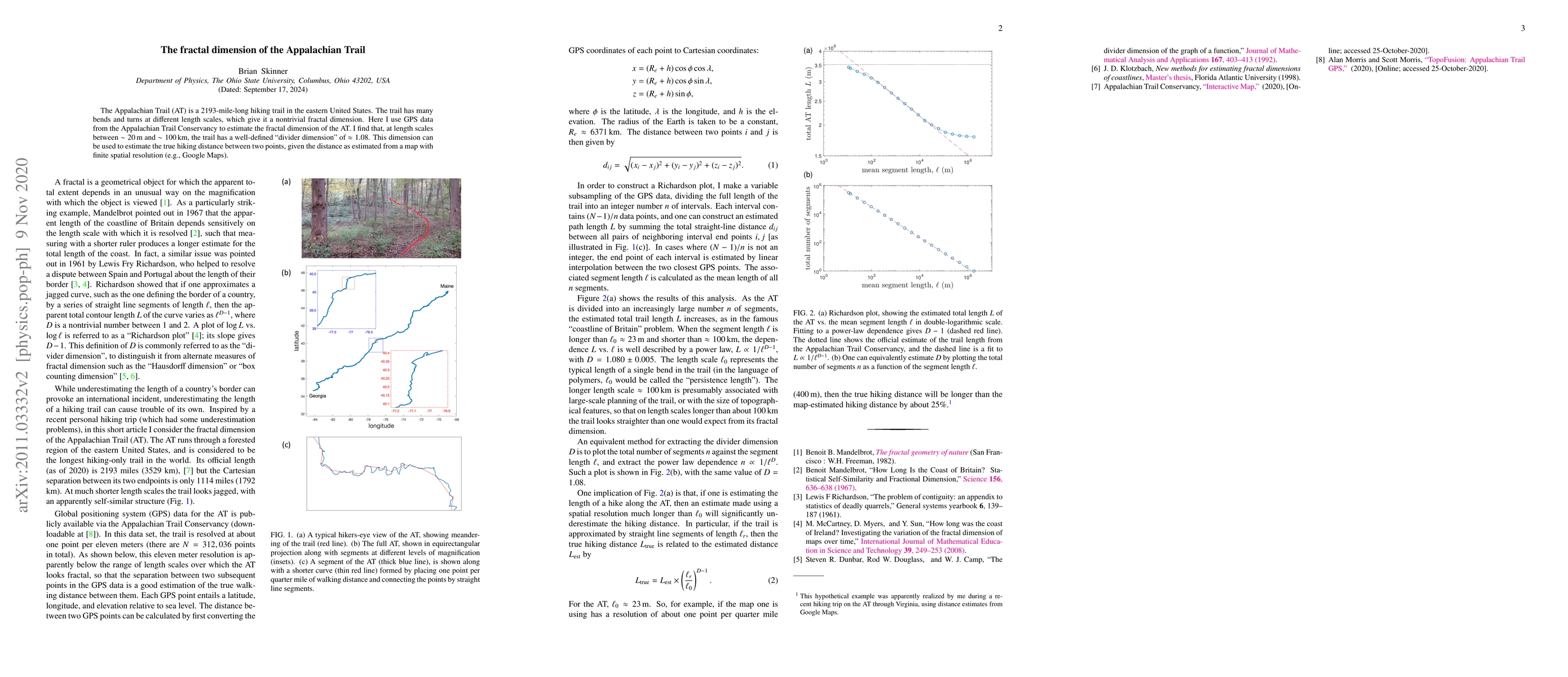 The Appalachian Trail has a fractal dimension of approximately 1.08 at length scales between 20m to 100km, allowing for more accurate distance estimations.