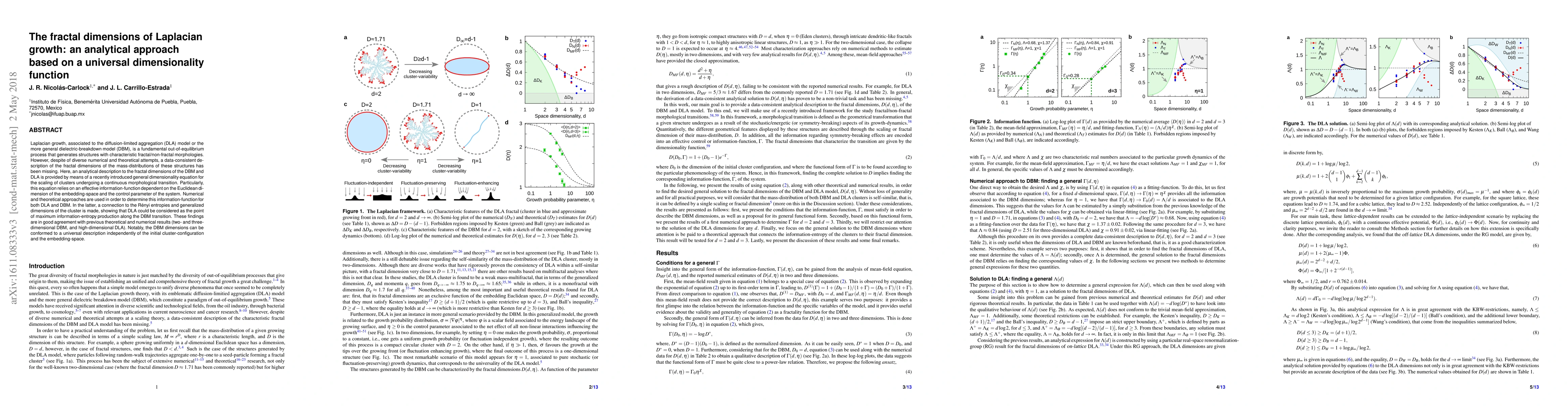 Laplacian growth, associated to the diffusion-limited aggregation (DLA) model or the more general dielectric-breakdown model (DBM), is a fundamental out-of-equilibrium process that generates structures with characteristic fractal/non-fractal morphologies. However, despite of diverse numerical and theoretical attempts, a data-consistent description of the fractal dimensions of the mass-distributions of these structures has been missing. Here, an analytical description to the fractal dimensions of the DBM and DLA is provided by means of a recently introduced general dimensionality equation for the scaling of clusters undergoing a continuous morphological transition. Particularly, this equation relies on an effective information-function dependent on the Euclidean dimension of the embedding-space and the control parameter of the system. Numerical and theoretical approaches are used in order to determine this information-function for both DLA and DBM. In the latter, a connection to the R\'enyi entropies and generalized dimensions of the cluster is made, showing that DLA could be considered as the point of maximum information-entropy production along the DBM transition. These findings are in good agreement with previous theoretical and numerical results (two- and three-dimensional DBM, and high-dimensional DLA). Notably, the DBM dimensions can be conformed to a universal description independently of the initial cluster-configuration and the embedding-space.