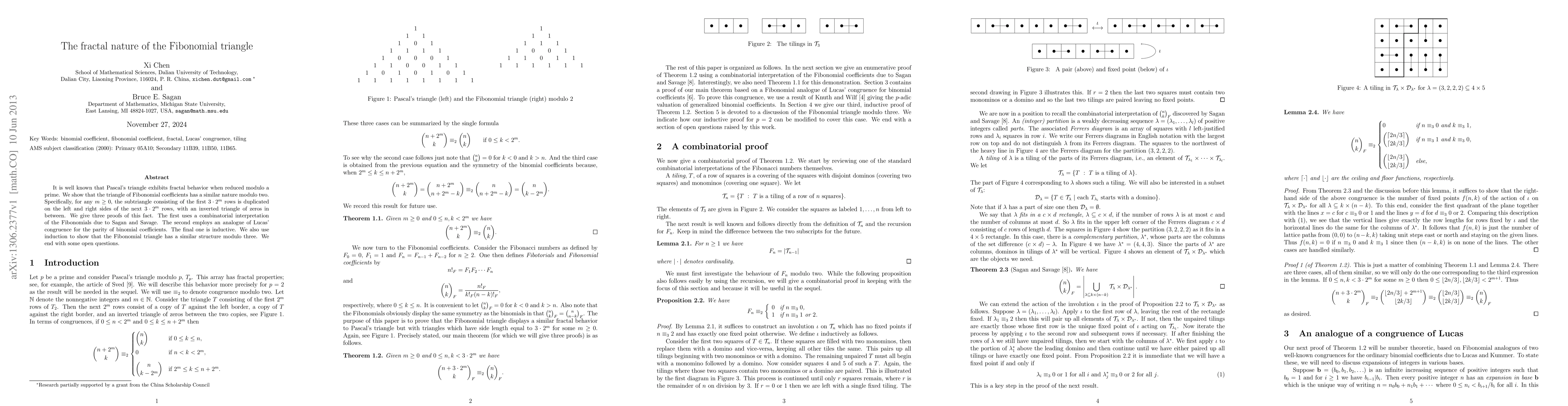 This paper demonstrates that the Fibonomial triangle exhibits fractal behavior modulo two, where subtriangles repeat with inverted zeros between them. Three proofs are provided, including combinatorial, congruence, and inductive approaches, and a similar structure is shown for modulo three using induction.