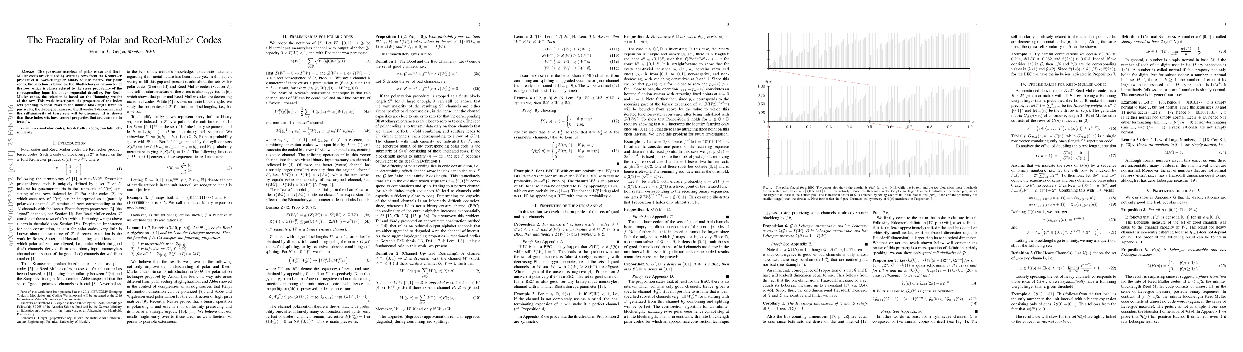 The generator matrices of polar codes and Reed-Muller codes are obtained by selecting rows from the Kronecker product of a lower-triangular binary square matrix. For polar codes, the selection is based on the Bhattacharyya parameter of the row, which is closely related to the error probability of the corresponding input bit under sequential decoding. For Reed-Muller codes, the selection is based on the Hamming weight of the row. This work investigates the properties of the index sets pointing to those rows in the infinite blocklength limit. In particular, the Lebesgue measure, the Hausdorff dimension, and the self-similarity of these sets will be discussed. It is shown that these index sets have several properties that are common to fractals.