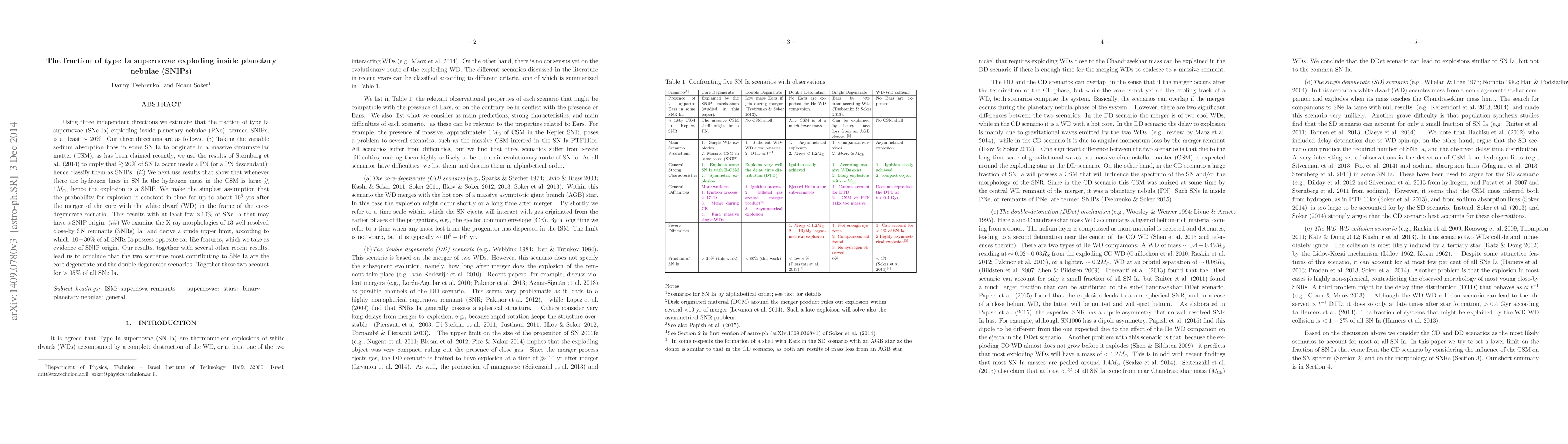 This research paper estimates that at least 20% of Type Ia supernovae (SNe Ia) occur within planetary nebulae (PNe), termed SNIPs, using three independent methods: (i) sodium absorption lines in SN Ia, (ii) hydrogen lines indicating large circumstellar matter, and (iii) X-ray morphologies of SN remnants. The study concludes that the core-degenerate and double degenerate scenarios account for over 95% of SNe Ia.