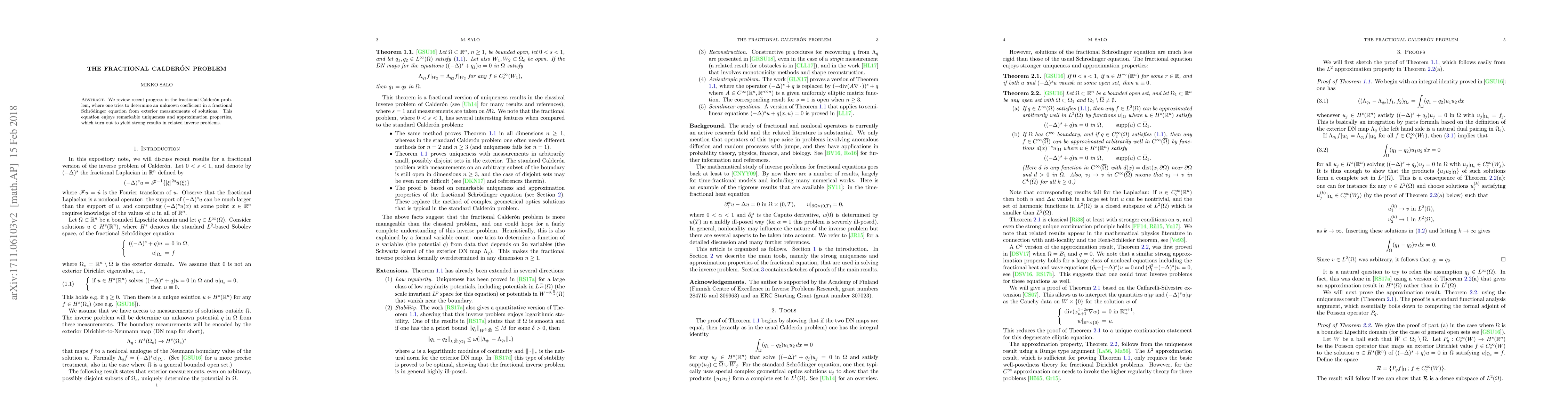 The paper reviews recent progress in the fractional Calderón problem, focusing on inverse problems related to fractional Schrödinger equations with unknown coefficients, determined by exterior measurements.