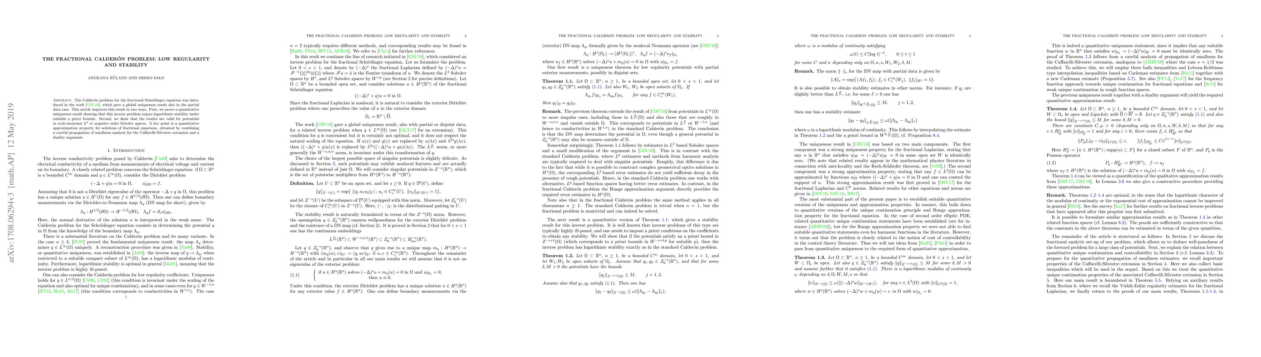 The Calder\'on problem for the fractional Schr\"odinger equation was introduced in the work \cite{GSU}, which gave a global uniqueness result also in the partial data case. This article improves this result in two ways. First, we prove a quantitative uniqueness result showing that this inverse problem enjoys logarithmic stability under suitable a priori bounds. Second, we show that the results are valid for potentials in scale-invariant $L^p$ or negative order Sobolev spaces. A key point is a quantitative approximation property for solutions of fractional equations, obtained by combining a careful propagation of smallness analysis for the Caffarelli-Silvestre extension and a duality argument.