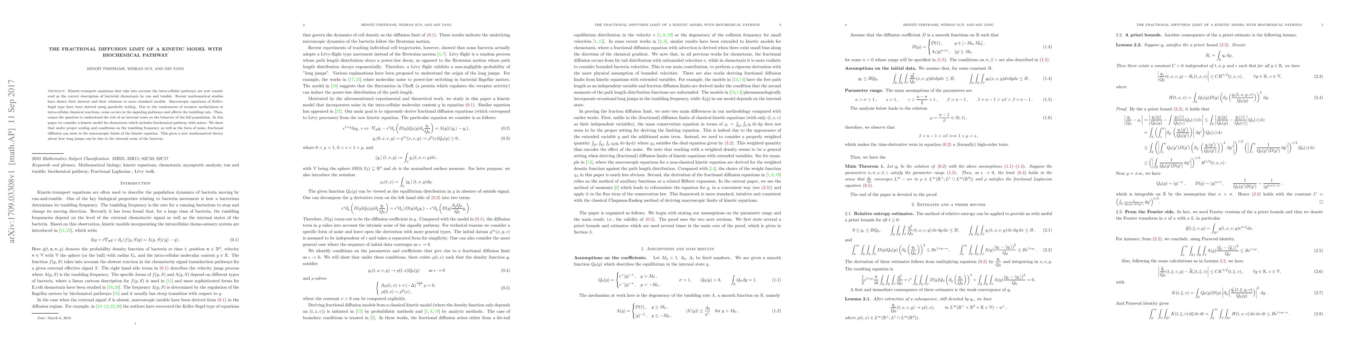 This paper investigates the fractional diffusion limit of a kinetic model for bacterial chemotaxis, incorporating biochemical pathways and internal noise. It demonstrates that under specific scaling and noise conditions, fractional diffusion emerges in the macroscopic limit, providing a new mathematical theory for long-jump behavior in bacteria due to internal noise.