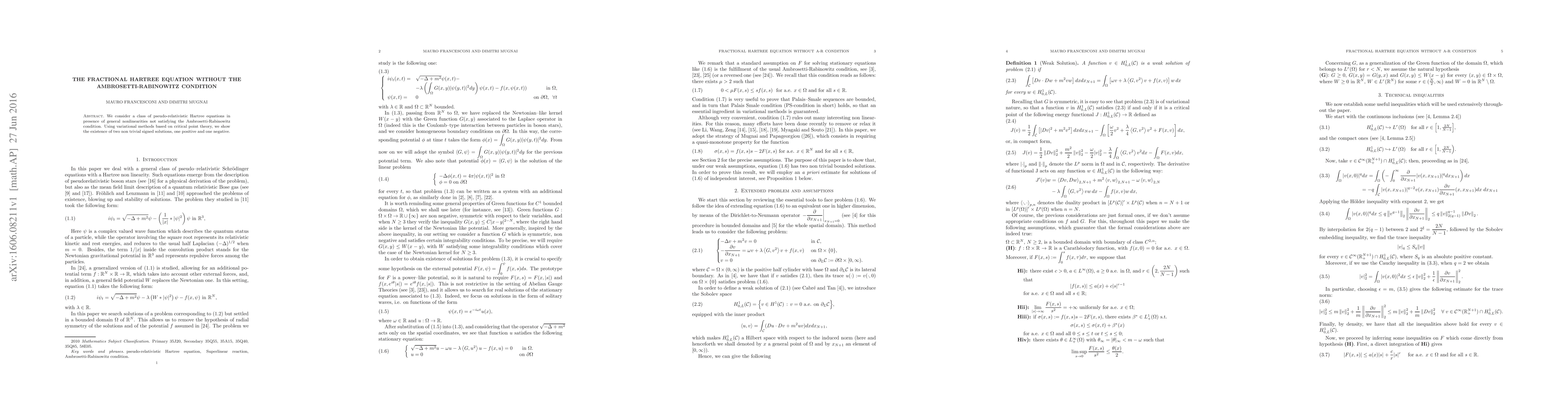 Summary: This paper investigates pseudo-relativistic Hartree equations with general nonlinearities that do not meet the Ambrosetti-Rabinowitz condition, proving the existence of two non-trivial signed solutions—one positive and one negative—using variational methods and critical point theory.