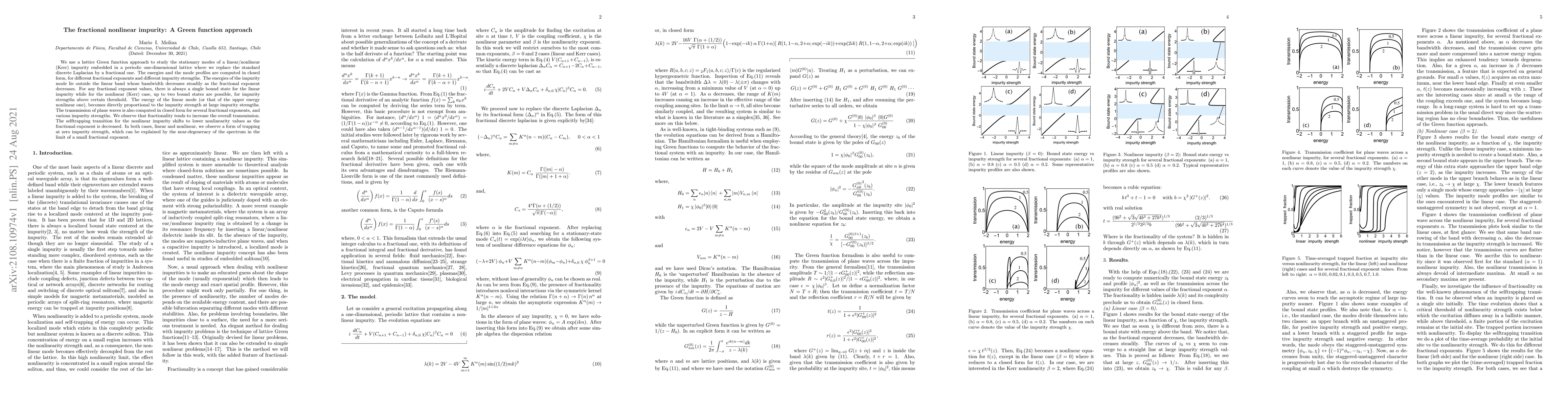 We use a lattice Green function approach to study the stationary modes of a linear/nonlinear (Kerr) impurity embedded in a periodic one-dimensional lattice where we replace the standard discrete Laplacian by a fractional one. The energies and the mode profiles are computed in closed form, for different fractional exponents and different impurity strengths. The energies of the impurity mode lie outside the linear band whose bandwidth decreases steadily as the fractional exponent decreases. For any fractional exponent values, there is always a single bound state for the linear impurity while for the nonlinear (Kerr) case, up to two bound states are possible, for impurity strengths above certain threshold. The energy of the linear mode (or that of the upper energy nonlinear one), becomes directly proportional to the impurity strength at large impurity strengths. The transmission of plane waves is also computed in closed form for several fractional exponents, and various impurity strengths. We observe that fractionality tends to increase the overall transmission. The selftrapping transition for the nonlinear impurity shifts to lower nonlinearity values as the fractional exponent is decreased. In both cases, linear and nonlinear, we observe a form of trapping at zero impurity strength, which can be explained by the near-degeneracy of the spectrum in the limit of a small fractional exponent.