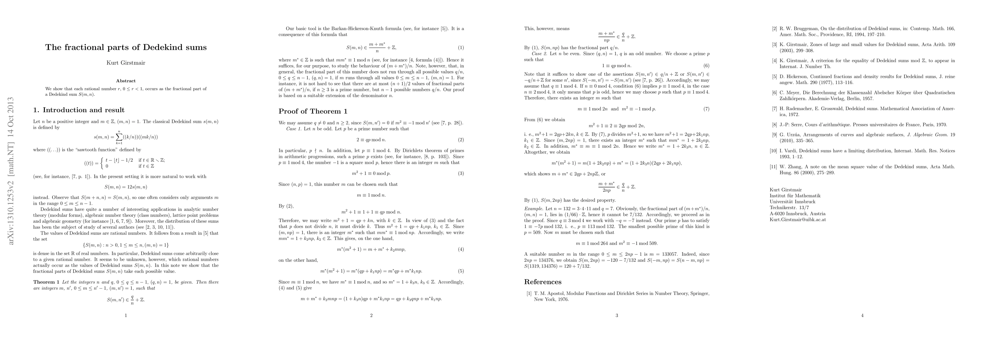 We show that each rational number $r$, $0\le r<1$, occurs as the fractional part of a Dedekind sum $S(m,n)$.