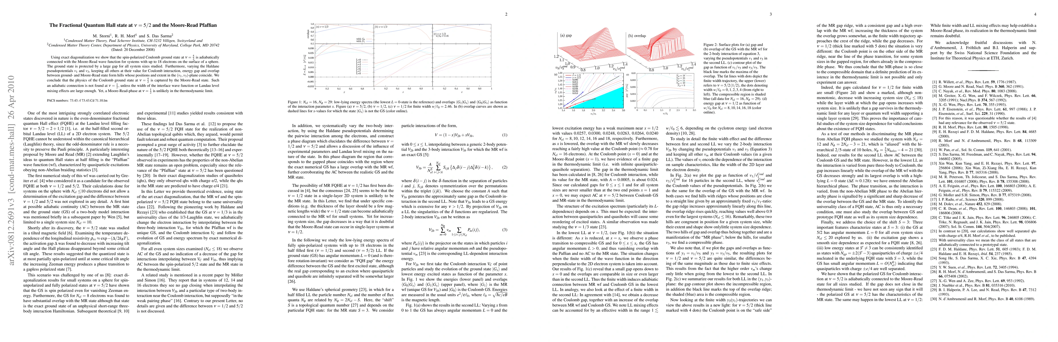 Results from exact diagonalization show that the spin-polarized Coulomb ground state at nu=5/2 is adiabatically connected with the Moore-Read wave function for systems with up to Nel = 16 electrons on the surface of a sphere. Varying the Haldane pseudopotentials v1 and v3, keeping all others at their value for Coulomb interaction, energy gap and (v1,v3)-dependent ground state overlap with the Moore-Read state form two ridges whose peak positions and extent in the (v1,v3)-plane essentially coincide. Thus, the physics of the Coulomb ground state at nu=5/2 is indeed captured by the Moore-Read state and that non-Abelian statistics can be expected under experimental conditions. Such adiabatic connection is not observed at nu=1/2, unless the width of the interface wave function and/or Landau level mixing effects are sufficiently large. Varying the width, an excitation gap is found for all system sizes Nel \le 18 studied. However, its system size dependence casts doubt on the existence of a Moore-Read-phase at nu=1/2 in the thermodynamic limit.