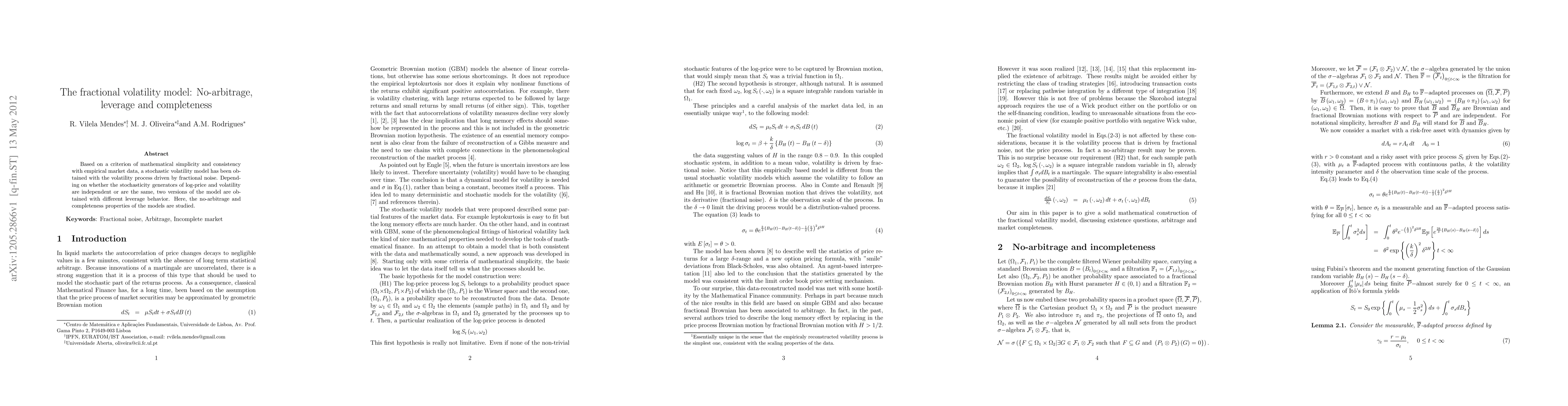 This paper develops a fractional volatility model driven by fractional noise, examining its no-arbitrage and completeness properties under different stochasticity conditions. The model's leverage behavior varies depending on whether the log-price and volatility stochasticity generators are independent or identical.