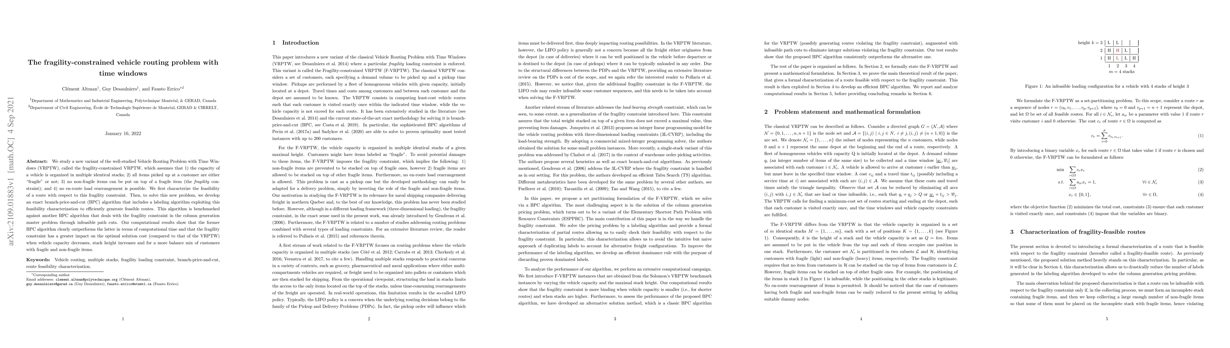 We study a new variant of the well-studied Vehicle Routing Problem with Time Windows (VRPTW), called the fragility-constrained VRPTW, which assumes that 1) the capacity of a vehicle is organized in multiple identical stacks; 2) all items picked up at a customer are either "fragile" or not; 3) no non-fragile items can be put on top of a fragile item (the fragility constraint) ; and 4) no en-route load rearrangement is possible. We first characterize the feasibility of a route with respect to this fragility constraint. Then, to solve this new problem, we develop an exact branch-price-and-cut (BPC) algorithm that includes a labeling algorithm exploiting this feasibility characterization to efficiently generate feasible routes. This algorithm is benchmarked against another BPC algorithm that deals with the fragility constraint in the column generation master problem through infeasible path cuts. Our computational results show that the former BPC algorithm clearly outperforms the latter in terms of computational time and that the fragility constraint has a greater impact on the optimal solution cost (compared to that of the VRPTW) when vehicle capacity decreases, stack height increases and for a more balance mix of customers with fragile and non-fragile items.