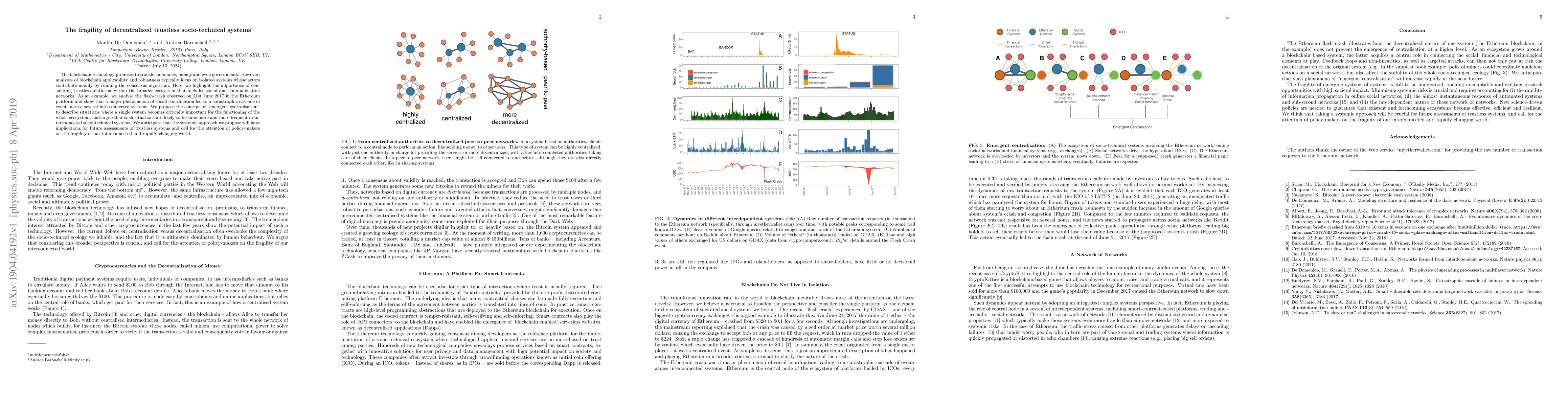The blockchain technology promises to transform finance, money and even governments. However, analyses of blockchain applicability and robustness typically focus on isolated systems whose actors contribute mainly by running the consensus algorithm. Here, we highlight the importance of considering trustless platforms within the broader ecosystem that includes social and communication networks. As an example, we analyse the flash-crash observed on 21st June 2017 in the Ethereum platform and show that a major phenomenon of social coordination led to a catastrophic cascade of events across several interconnected systems. We propose the concept of ``emergent centralisation'' to describe situations where a single system becomes critically important for the functioning of the whole ecosystem, and argue that such situations are likely to become more and more frequent in interconnected socio-technical systems. We anticipate that the systemic approach we propose will have implications for future assessments of trustless systems and call for the attention of policy-makers on the fragility of our interconnected and rapidly changing world.