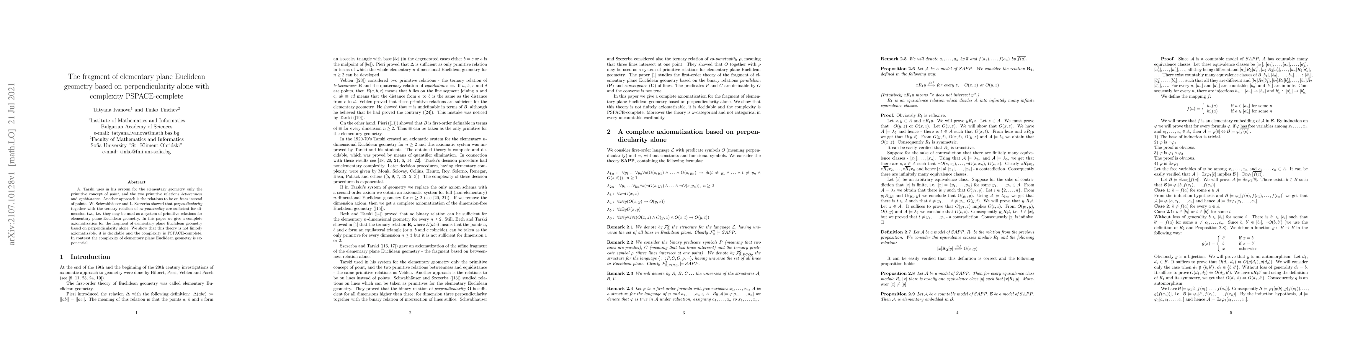 A new axiomatization is given for elementary plane Euclidean geometry based on perpendicularity alone, showing it's PSPACE-complete and not finitely axiomizable.