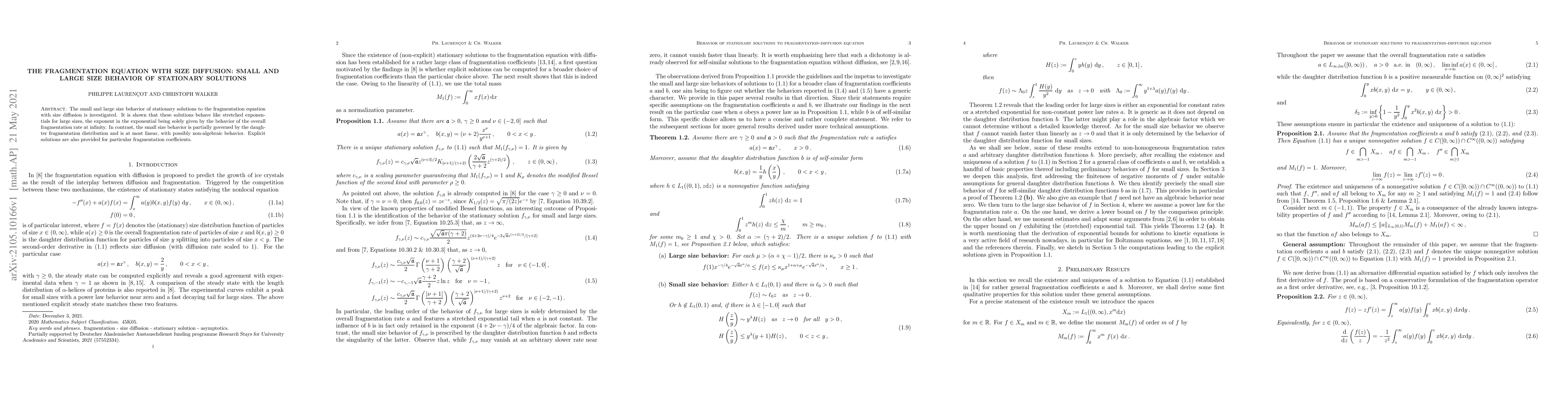 The fragmentation equation with size diffusion reveals that large-size solutions behave like stretched exponentials, while small-size behavior is influenced by the daughter fragmentation distribution, potentially leading to non-algebraic growth.
