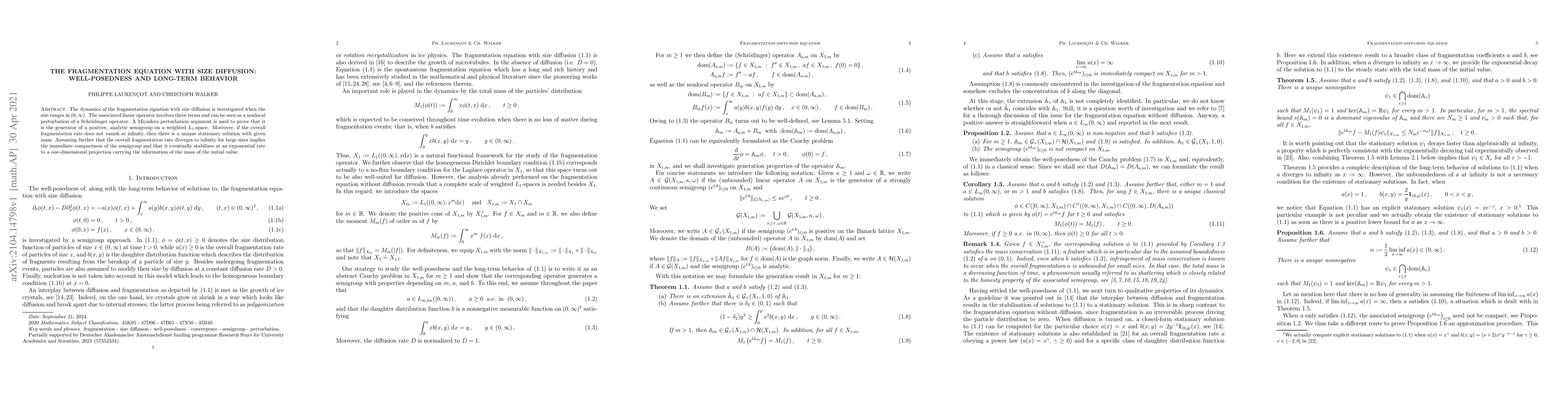 The dynamics of the fragmentation equation with size diffusion is investigated when the size ranges in (0, $\infty$). The associated linear operator involves three terms and can be seen as a nonlocal perturbation of a Schr{\"o}dinger operator. A Miyadera perturbation argument is used to prove that it is the generator of a positive, analytic semigroup on a weighted $L_1$-space. Moreover, if the overall fragmentation rate does not vanish at infinity, then there is a unique stationary solution with given mass. Assuming further that the overall fragmentation rate diverges to infinity for large sizes implies the immediate compactness of the semigroup and that it eventually stabilizes at an exponential rate to a one-dimensional projection carrying the information of the mass of the initial value.