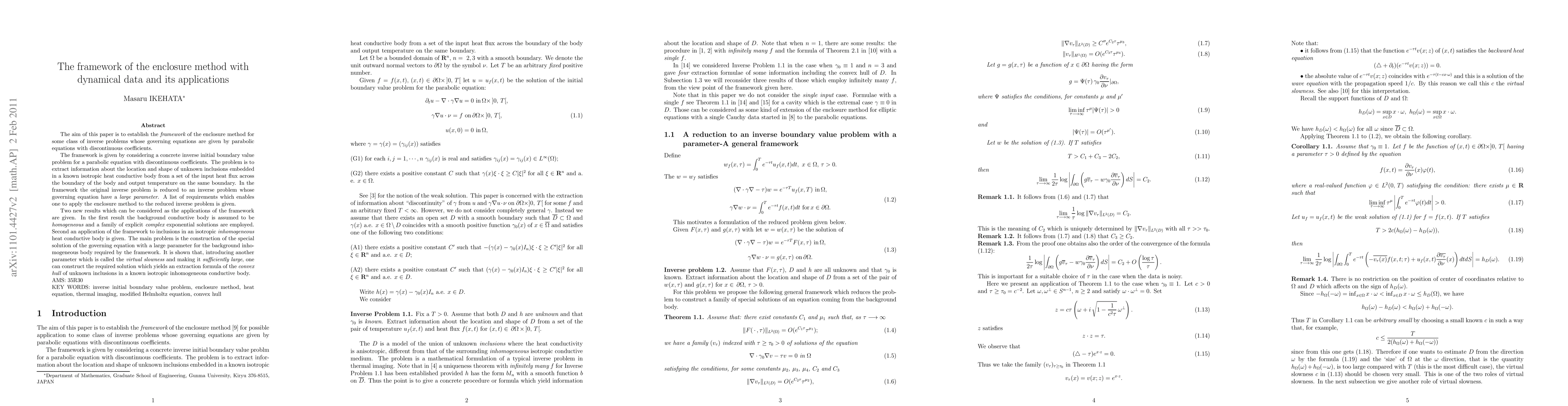 The aim of this paper is to establish the framework of the enclosure method for some class of inverse problems whose governing equations are given by parabolic equations with discontinuous coefficients. The framework is given by considering a concrete inverse initial boundary value problem for a parabolic equation with discontinuous coefficients. The problem is to extract information about the location and shape of unknown inclusions embedded in a known isotropic heat conductive body from a set of the input heat flux across the boundary of the body and output temperature on the same boundary. In the framework the original inverse problem is reduced to an inverse problem whose governing equation has a large parameter. A list of requirements which enables one to apply the enclosure method to the reduced inverse problem is given. Two new results which can be considered as the application of the framework are given. In the first result the background conductive body is assumed to be homogeneous and a family of explicit complex exponential solutions are employed. Second an application of the framework to inclusions in an isotropic inhomogeneous heat conductive body is given. The main problem is the construction of the special solution of the governing equation with a large parameter for the background inhomogeneous body required by the framework. It is shown that, introducing another parameter which is called the virtual slowness and making it sufficiently large, one can construct the required solution which yields an extraction formula of the convex hull of unknown inclusions in a known isotropic inhomogeneous conductive body.