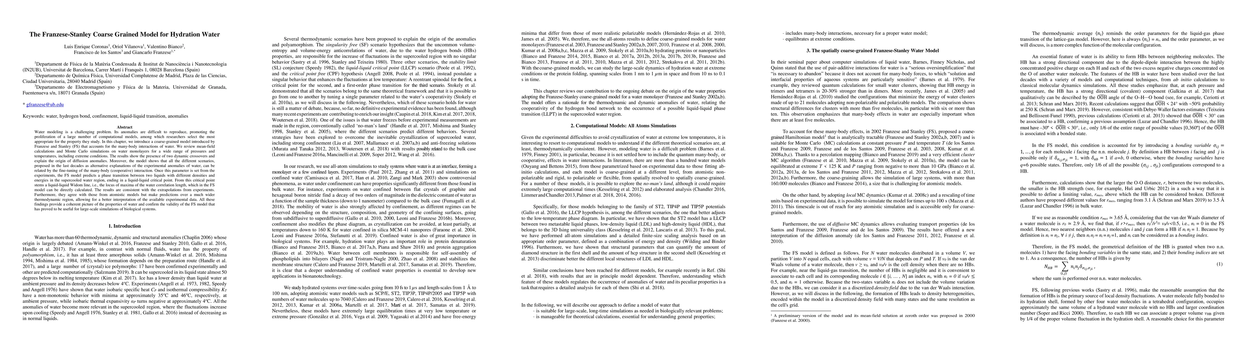 The Franzese-Stanley (FS) coarse-grained water model explains water anomalies via many-body interactions, revealing two dynamic crossovers and a phase transition in supercooled water. This model predicts a liquid-liquid critical point and Widom line, agreeing with atomistic models and experimental data, thus offering insights for large-scale simulations of biological systems.