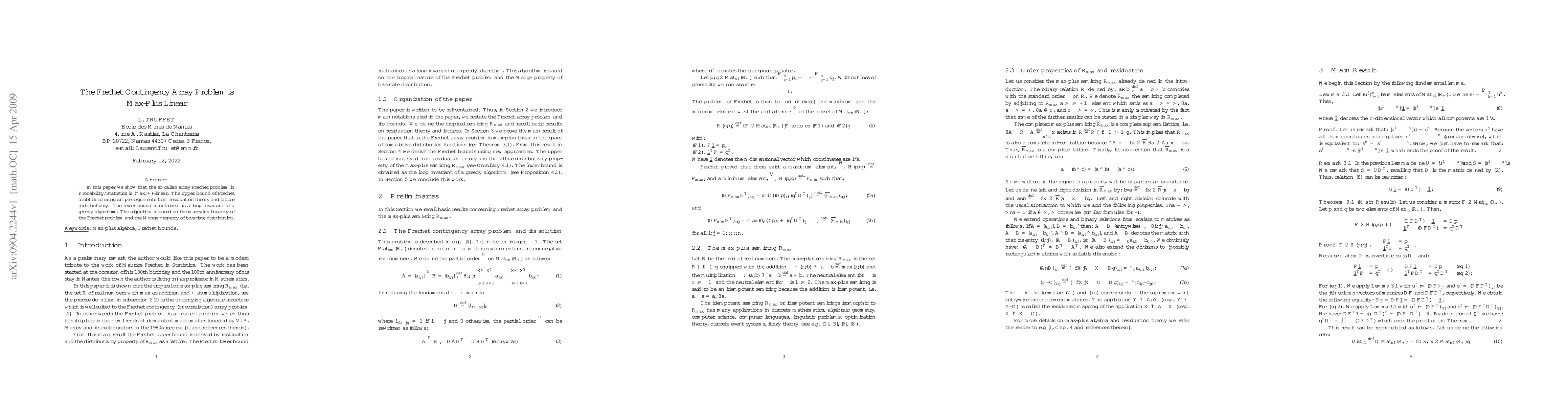 In this paper we show that the so-called array Fr\'echet problem in Probability/Statistics is (max, +)-linear. The upper bound of Fr\'echet is obtained using simple arguments from residuation theory and lattice distributivity. The lower bound is obtained as a loop invariant of a greedy algorithm. The algorithm is based on the max-plus linearity of the Fr\'echet problem and the Monge property of bivariate distribution.