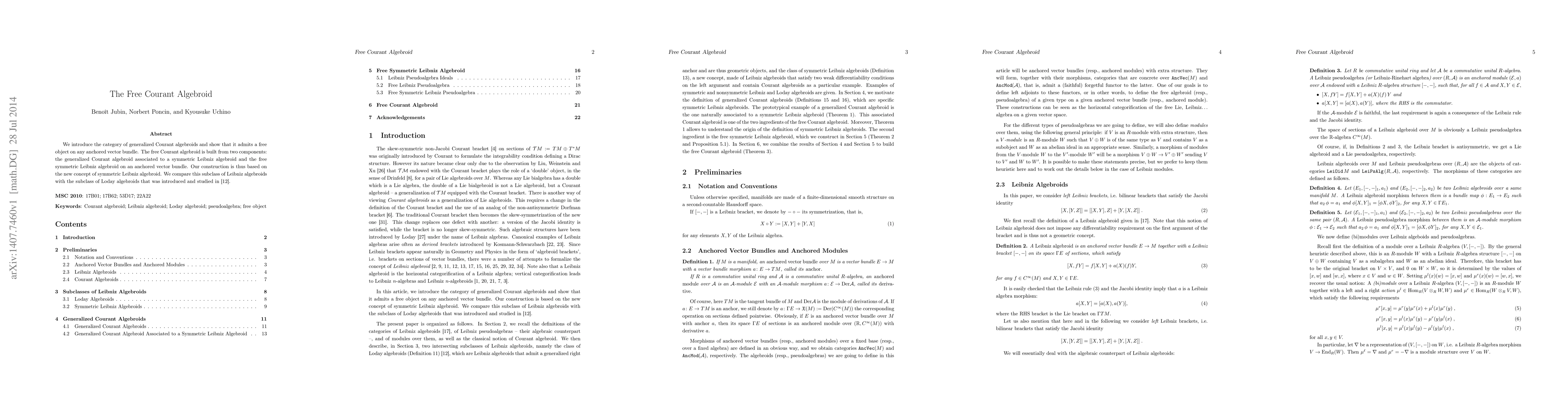 We introduce the category of generalized Courant algebroids and show that it admits a free object on any anchored vector bundle. The free Courant algebroid is built from two components: the generalized Courant algebroid associated to a symmetric Leibniz algebroid and the free symmetric Leibniz algebroid on an anchored vector bundle. Our construction is thus based on the new concept of symmetric Leibniz algebroid. We compare this subclass of Leibniz algebroids with the subclass of Loday algebroids that was introduced and studied in a previous paper of Grabowski, Khudaverdyan and Poncin.