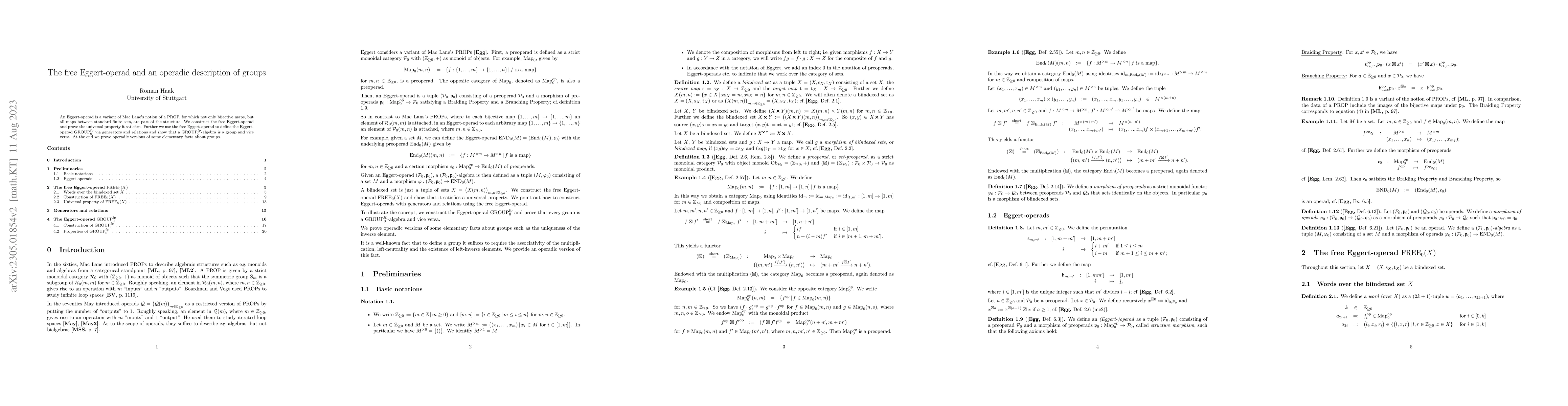 An Eggert-operad is a variant of Mac Lane's notion of a PROP, for which not only bijective maps, but all maps between standard finite sets, are part of the structure. We construct the free Eggert-operad and prove the universal property it satisfies. Further we use the free Eggert-operad to define the Eggert-operad $\mathrm{GROUP}_0^{\mathrm{fp}}$ via generators and relations and show that a $\mathrm{GROUP}_0^{\mathrm{fp}}$-algebra is a group and vice versa. At the end we prove operadic versions of some elementary facts about groups.