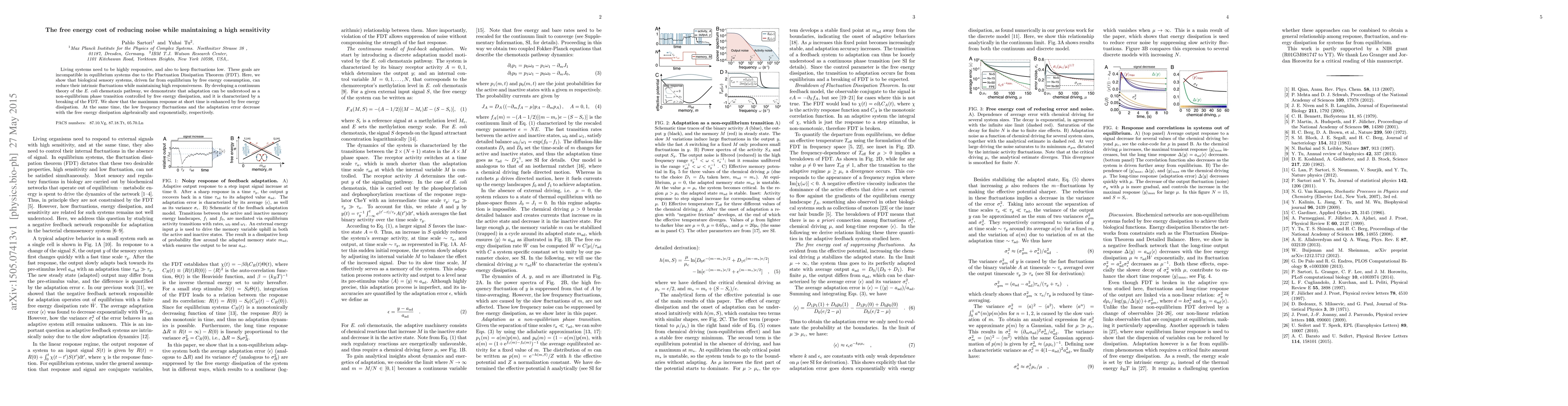 Living systems need to be highly responsive, and also to keep fluctuations low. These goals are incompatible in equilibrium systems due to the Fluctuation Dissipation Theorem (FDT). Here, we show that biological sensory systems, driven far from equilibrium by free energy consumption, can reduce their intrinsic fluctuations while maintaining high responsiveness. By developing a continuum theory of the E. coli chemotaxis pathway, we demonstrate that adaptation can be understood as a non-equilibrium phase transition controlled by free energy dissipation, and it is characterized by a breaking of the FDT. We show that the maximum response at short time is enhanced by free energy dissipation. At the same time, the low frequency fluctuations and the adaptation error decrease with the free energy dissipation algebraically and exponentially, respectively.