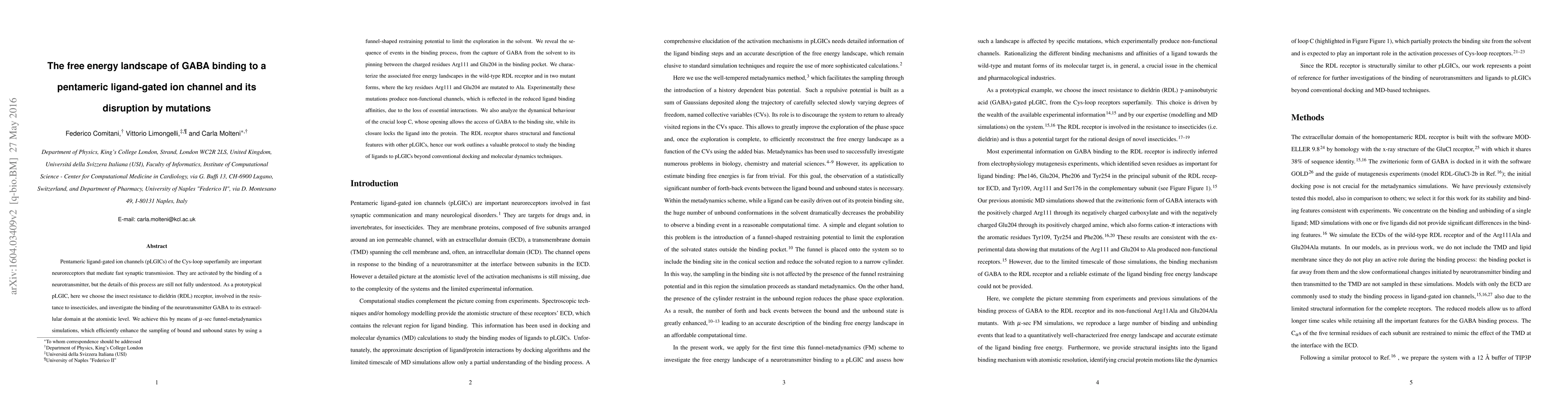 This paper uses $\mu$-sec funnel-metadynamics simulations to explore the binding of GABA to the insect RDL receptor, revealing the free energy landscape and the sequence of binding events. Mutations in key residues disrupt binding, highlighting the importance of these interactions for receptor function.