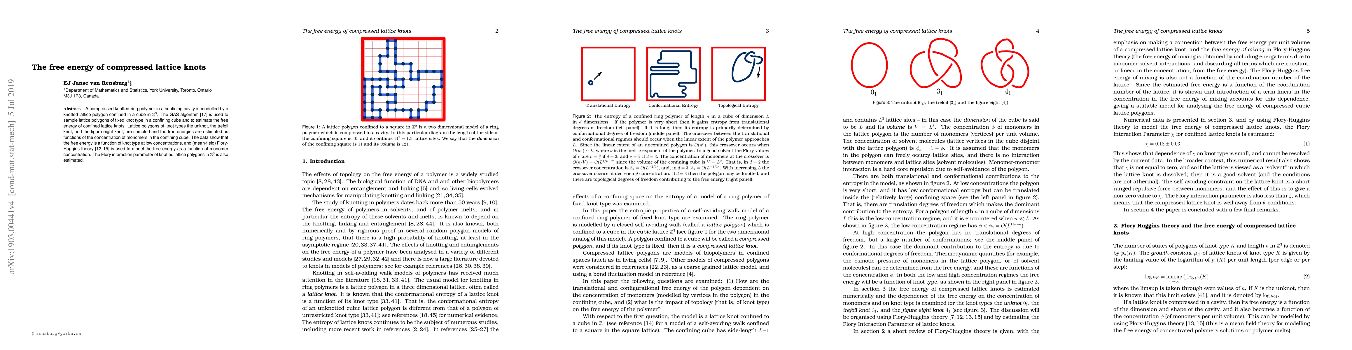 This paper models compressed knotted ring polymers in a lattice framework and uses the GAS algorithm to estimate the free energy of various knot types under different monomer concentrations. The study shows that knot type significantly influences free energy at low concentrations, and it employs Flory-Huggins theory to model this relationship.