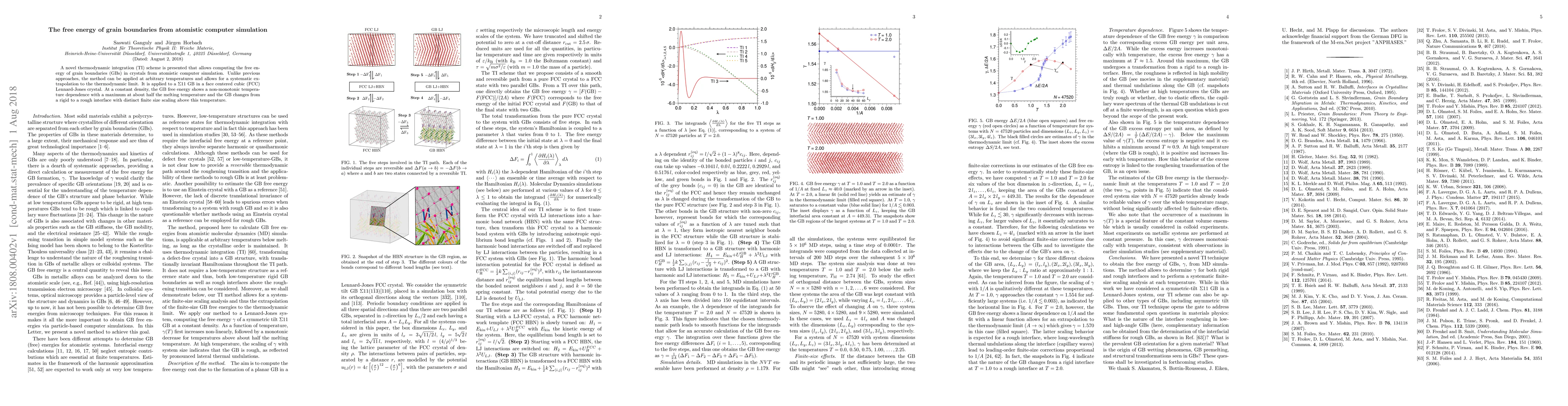 This paper introduces a new thermodynamic integration method for calculating the free energy of grain boundaries in crystals from atomistic simulations, applicable at any temperature and scalable to the thermodynamic limit. The method reveals a non-monotonic temperature dependence for a $\Sigma11$ grain boundary in an FCC Lennard-Jones crystal, showing a transition from a rigid to a rough interface at half the melting temperature.