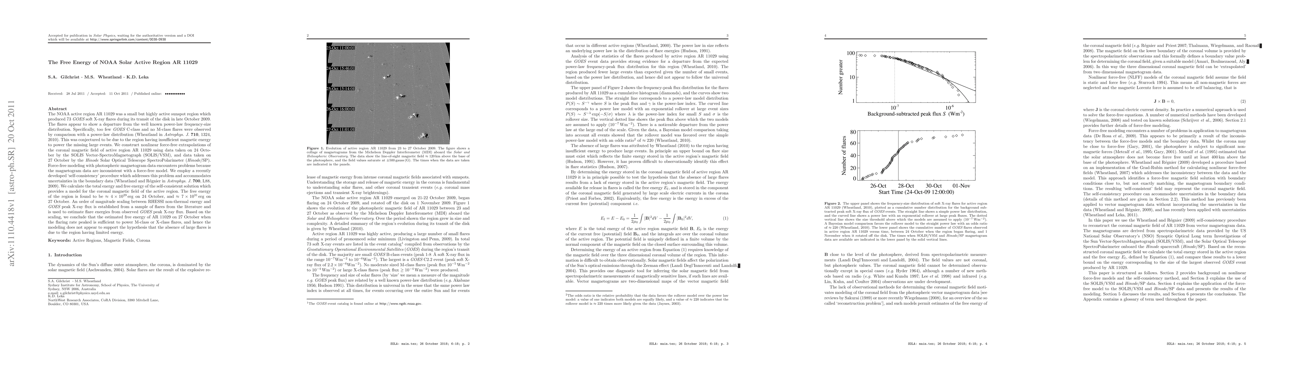 The NOAA active region AR 11029 was a small but highly active sunspot region which produced 73 GOES soft X-ray flares. The flares appear to show a departure from the well known power-law frequency-size distribution. Specifically, too few GOES C-class and no M-class flares were observed by comparison with a power-law distribution (Wheatland in Astrophys. J. 710, 1324, 2010). This was conjectured to be due to the region having insufficient magnetic energy to power large events. We construct nonlinear force-free extrapolations of the coronal magnetic field of active region AR 11029 using data taken on 24 October by the SOLIS Vector-SpectroMagnetograph (SOLIS/VSM), and data taken on 27 October by the Hinode Solar Optical Telescope SpectroPolarimeter (Hinode/SP). Force-free modeling with photospheric magnetogram data encounters problems because the magnetogram data are inconsistent with a force-free model, and we employ a recently developed `self-consistency' procedure which addresses this and accommodates uncertainties in the boundary data (Wheatland and Regnier in Astrophys. J. 700, L88, 2009). We calculate the total energy and free energy of the self-consistent solution and find that the free energy was 4x10^29 erg on 24 October, and 7x10^31 erg on 27 October. An order of magnitude scaling between RHESSI non-thermal energy and GOES peak X-ray flux is established from a sample of flares from the literature and is used to estimate flare energies from observed GOES peak X-ray flux. Based on the scaling, we conclude that the estimated free energy of AR 11029 on 27 October when the flaring rate peaked is sufficient to power M-class or X-class flares, and hence the modeling does not appear to support the hypothesis that the absence of large flares is due to the region having limited energy.