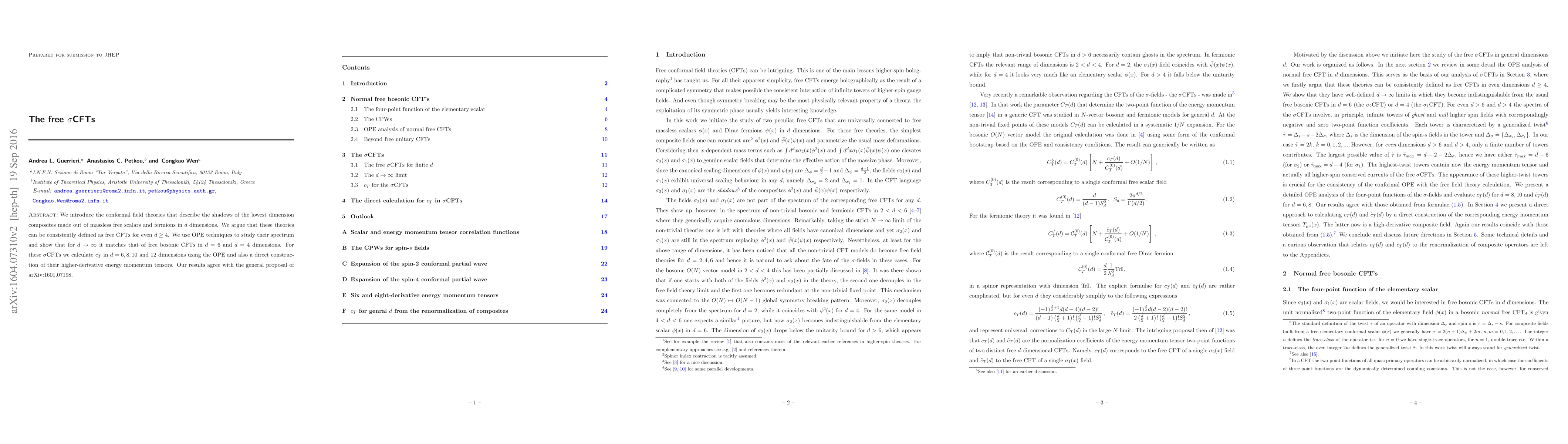 We introduce the conformal field theories that describe the shadows of the lowest dimension composites made out of massless free scalars and fermions in $d$ dimensions. We argue that these theories can be consistently defined as free CFTs for even $d\geq 4$. We use OPE techniques to study their spectrum and show that for $d\rightarrow\infty$ it matches that of free bosonic CFTs in $d=6$ and $d=4$ dimensions. For these $\sigma$CFTs we calculate $c_T$ in $d=6,8,10$ and $12$ dimensions using the OPE and also a direct construction of their higher-derivative energy momentum tensors. Our results agree with the general proposal of arXiv:1601.07198.