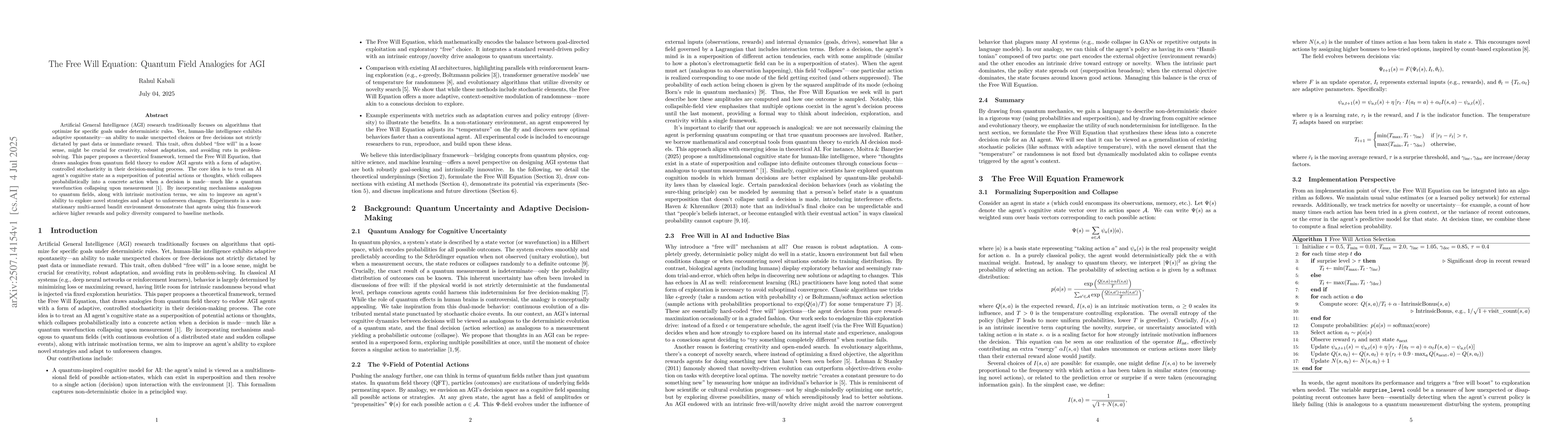Artificial General Intelligence (AGI) research traditionally focuses on algorithms that optimize for specific goals under deterministic rules. Yet, human-like intelligence exhibits adaptive spontaneity - an ability to make unexpected choices or free decisions not strictly dictated by past data or immediate reward. This trait, often dubbed "free will" in a loose sense, might be crucial for creativity, robust adaptation, and avoiding ruts in problem-solving. This paper proposes a theoretical framework, called the Free Will Equation, that draws analogies from quantum field theory to endow AGI agents with a form of adaptive, controlled stochasticity in their decision-making process. The core idea is to treat an AI agent's cognitive state as a superposition of potential actions or thoughts, which collapses probabilistically into a concrete action when a decision is made - much like a quantum wavefunction collapsing upon measurement. By incorporating mechanisms analogous to quantum fields, along with intrinsic motivation terms, we aim to improve an agent's ability to explore novel strategies and adapt to unforeseen changes. Experiments in a non-stationary multi-armed bandit environment demonstrate that agents using this framework achieve higher rewards and policy diversity compared to baseline methods.