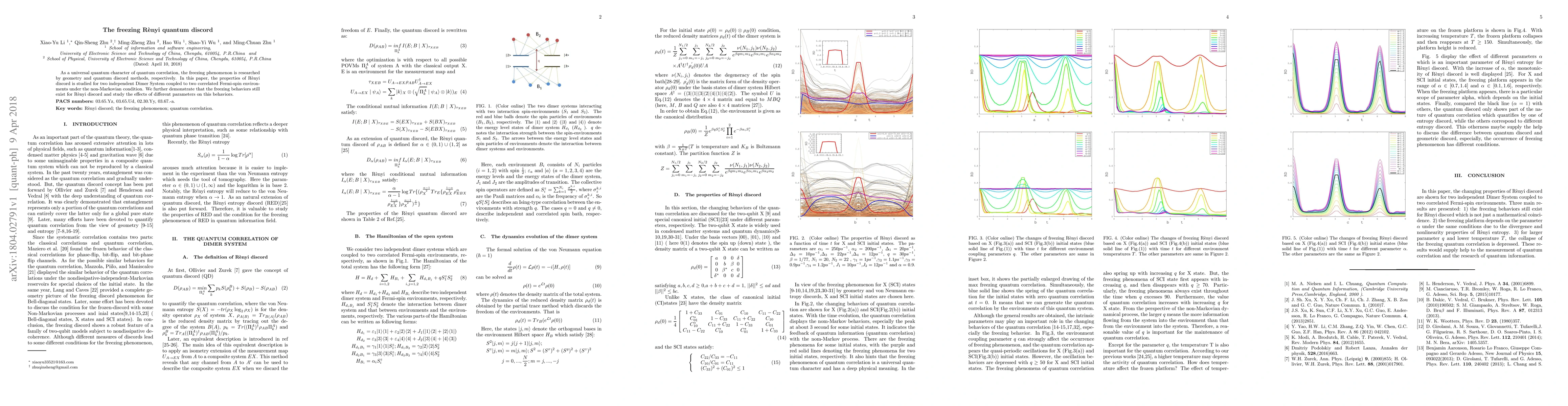 As a universal quantum character of quantum correlation, the freezing phenomenon is researched by geometry and quantum discord methods, respectively. In this paper, the properties of R`enyi discord is studied for two independent Dimer System coupled to two correlated Fermi-spin environments under the non-Markovian condition. We further demonstrate that the freezing behaviors still exist for R`enyi discord and study the effects of different parameters on this behaviors.