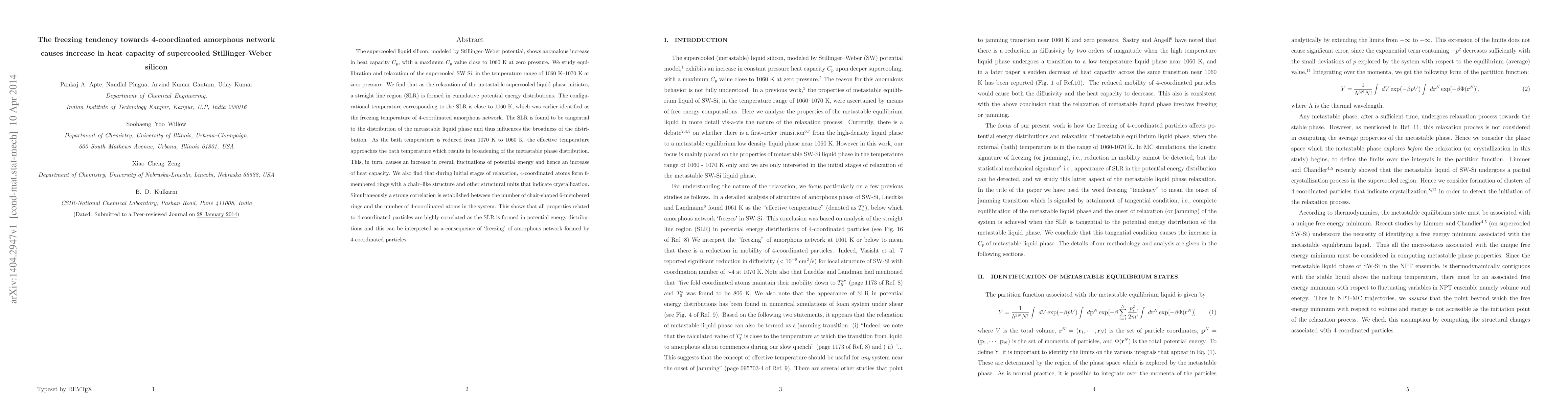 The Stillinger-Weber silicon model exhibits an anomalous increase in heat capacity due to the freezing tendency of its 4-coordinated amorphous network, which broadens the metastable phase distribution and enhances potential energy fluctuations. The formation of chair-like 6-membered rings during relaxation indicates crystallization and a strong correlation between 4-coordinated atoms and these structural units.