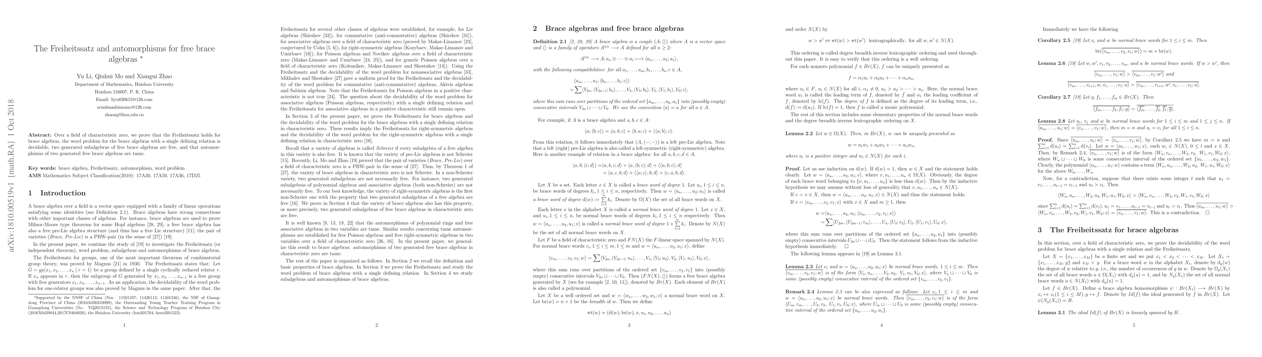 Summary: The research demonstrates that the Freiheitssatz applies to free brace algebras over fields of characteristic zero, establishing decidability for the word problem in these algebras, and proving that two-generated subalgebras are free, along with tame automorphisms for such algebras.