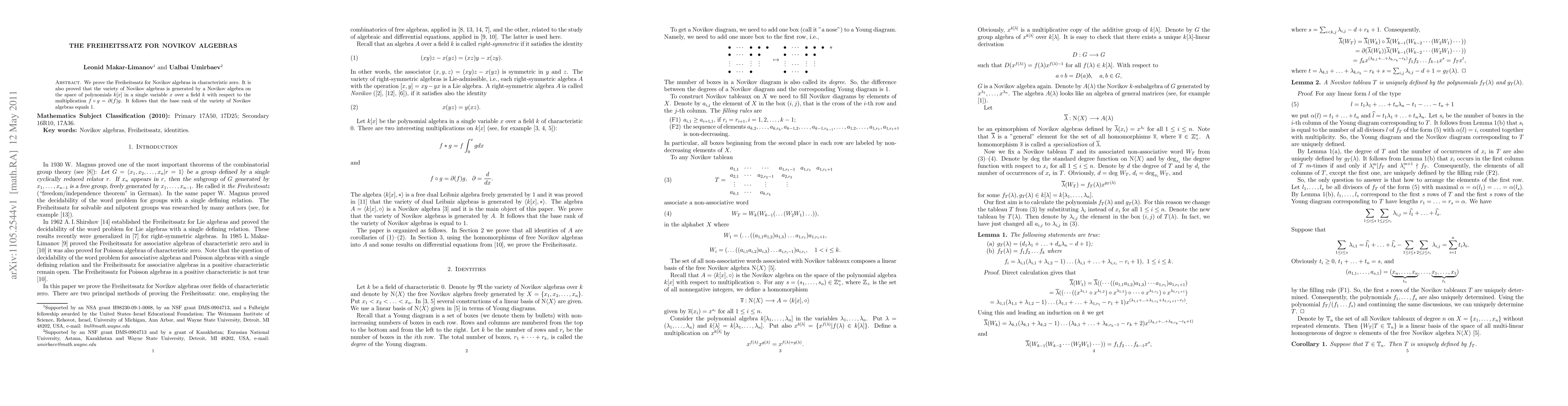 Summary: The research establishes the Freiheitssatz for Novikov algebras in characteristic zero and shows that this variety is generated by a Novikov algebra based on polynomial functions with a specific multiplication operation, resulting in a base rank of 1.