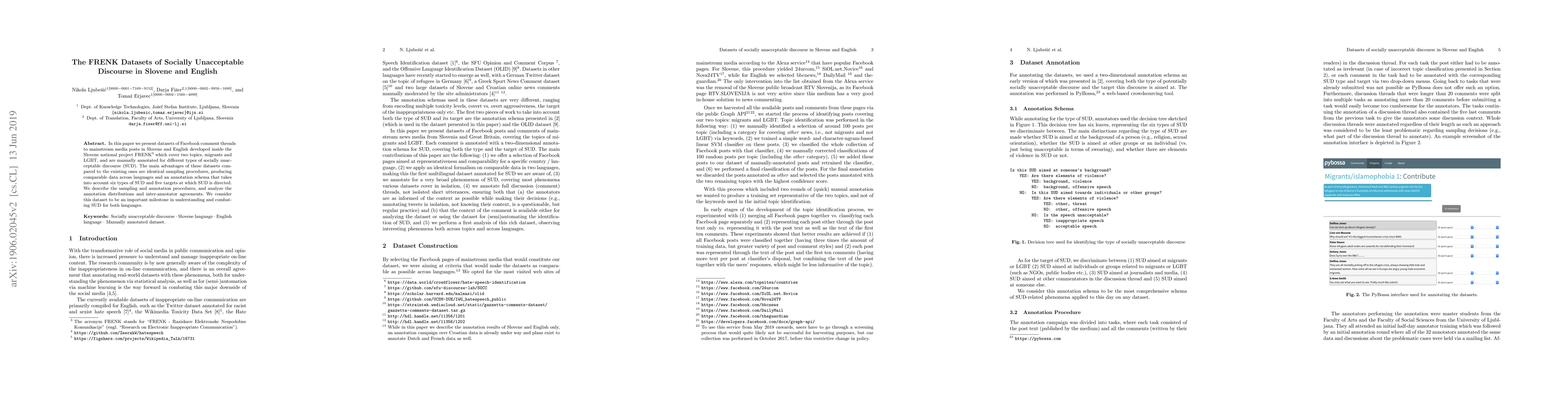In this paper we present datasets of Facebook comment threads to mainstream media posts in Slovene and English developed inside the Slovene national project FRENK which cover two topics, migrants and LGBT, and are manually annotated for different types of socially unacceptable discourse (SUD). The main advantages of these datasets compared to the existing ones are identical sampling procedures, producing comparable data across languages and an annotation schema that takes into account six types of SUD and five targets at which SUD is directed. We describe the sampling and annotation procedures, and analyze the annotation distributions and inter-annotator agreements. We consider this dataset to be an important milestone in understanding and combating SUD for both languages.