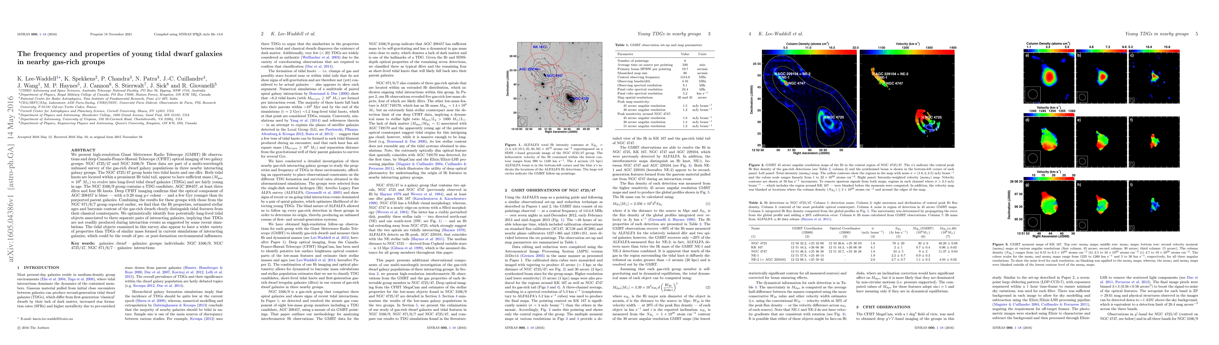 This study uses GMRT HI observations and CFHT optical imaging to investigate tidal dwarf galaxies (TDGs) in two nearby gas-rich galaxy groups, finding that TDGs exhibit distinct HI properties and younger stellar ages compared to classical dwarfs. The survey identifies four potential long-lived TDGs, suggesting that TDGs are not as common in interactions as some simulations predict, and they display a wider range of properties than simulated TDGs.